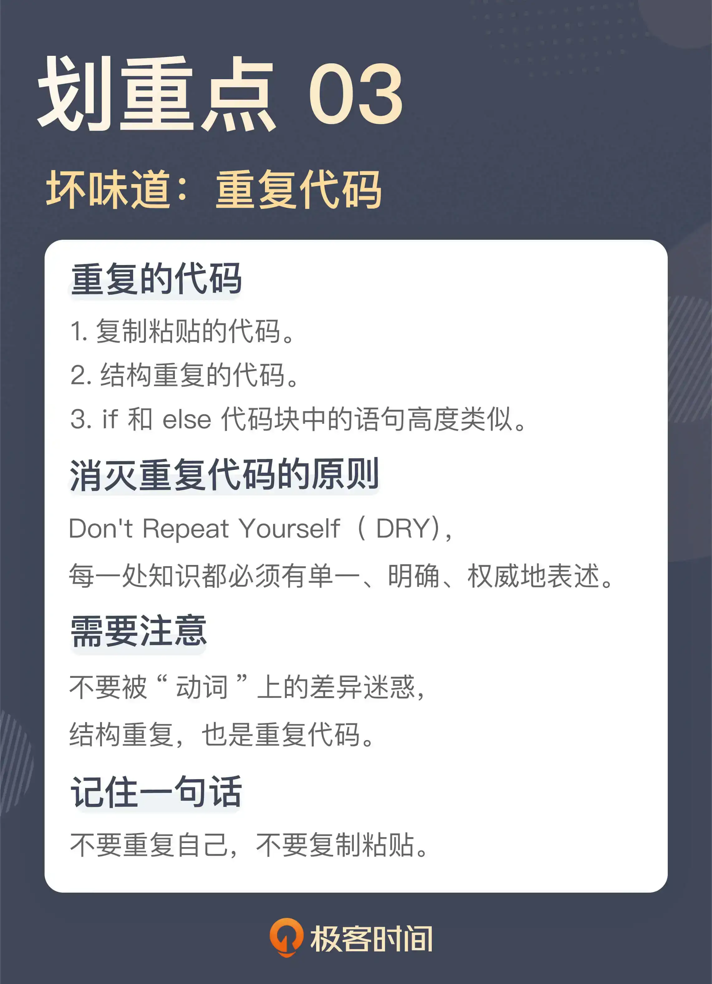 重复是一个泥潭,对于程序员来说,时刻提醒自己不要重复是至关重要的。在软件开发里,有一个重要的原则叫做 Don’t Repeat Yourself(不要重复自己,简称 DRY),我在《[软件设计之美]》中也讲到过它,而更经典的叙述在《[程序员修炼之道]》中。