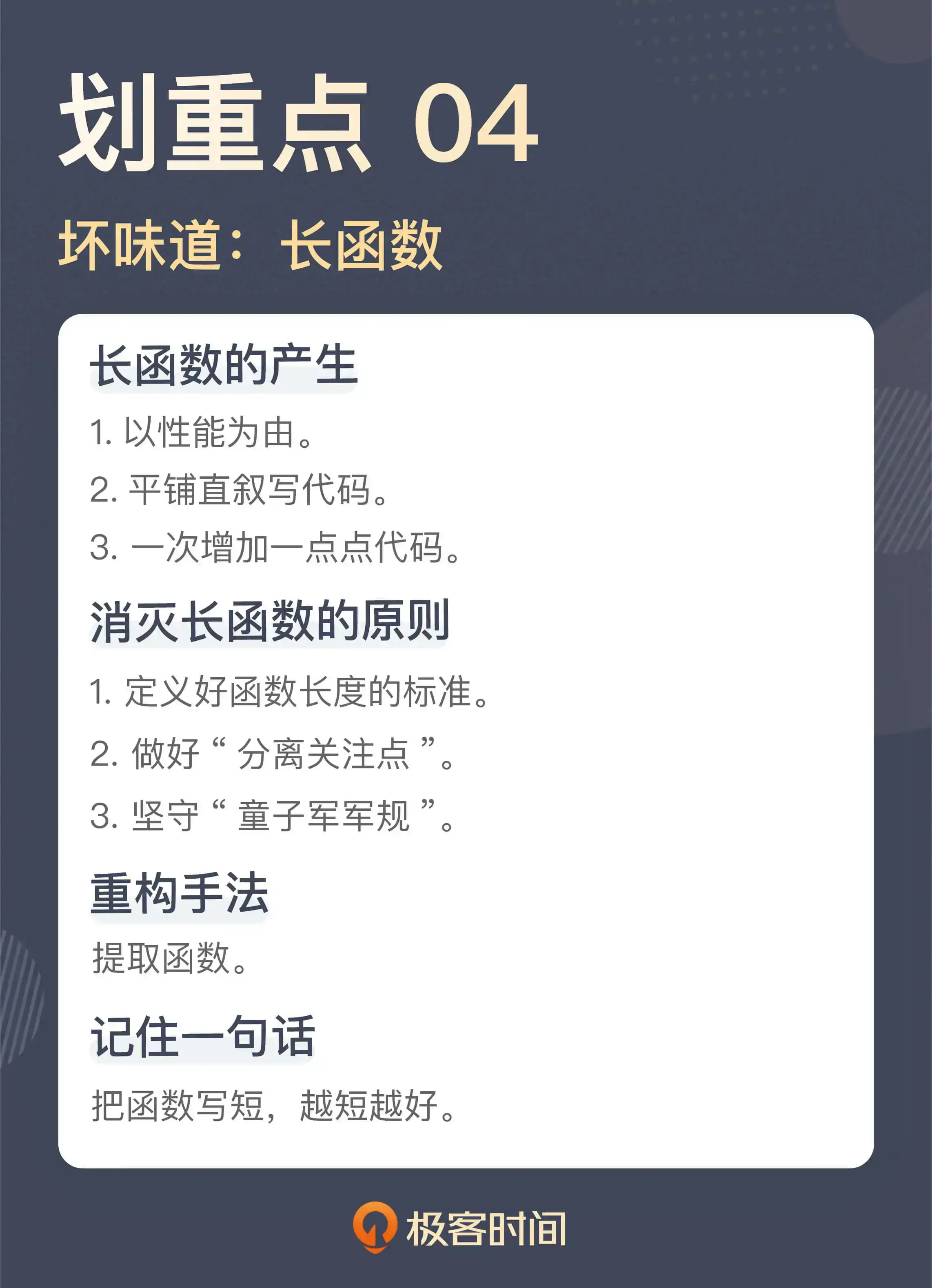 今天我们讲了程序员最深恶痛绝的坏味道:长函数。没有人愿意去阅读长函数,但许多人又会不经意间写出长函数。
