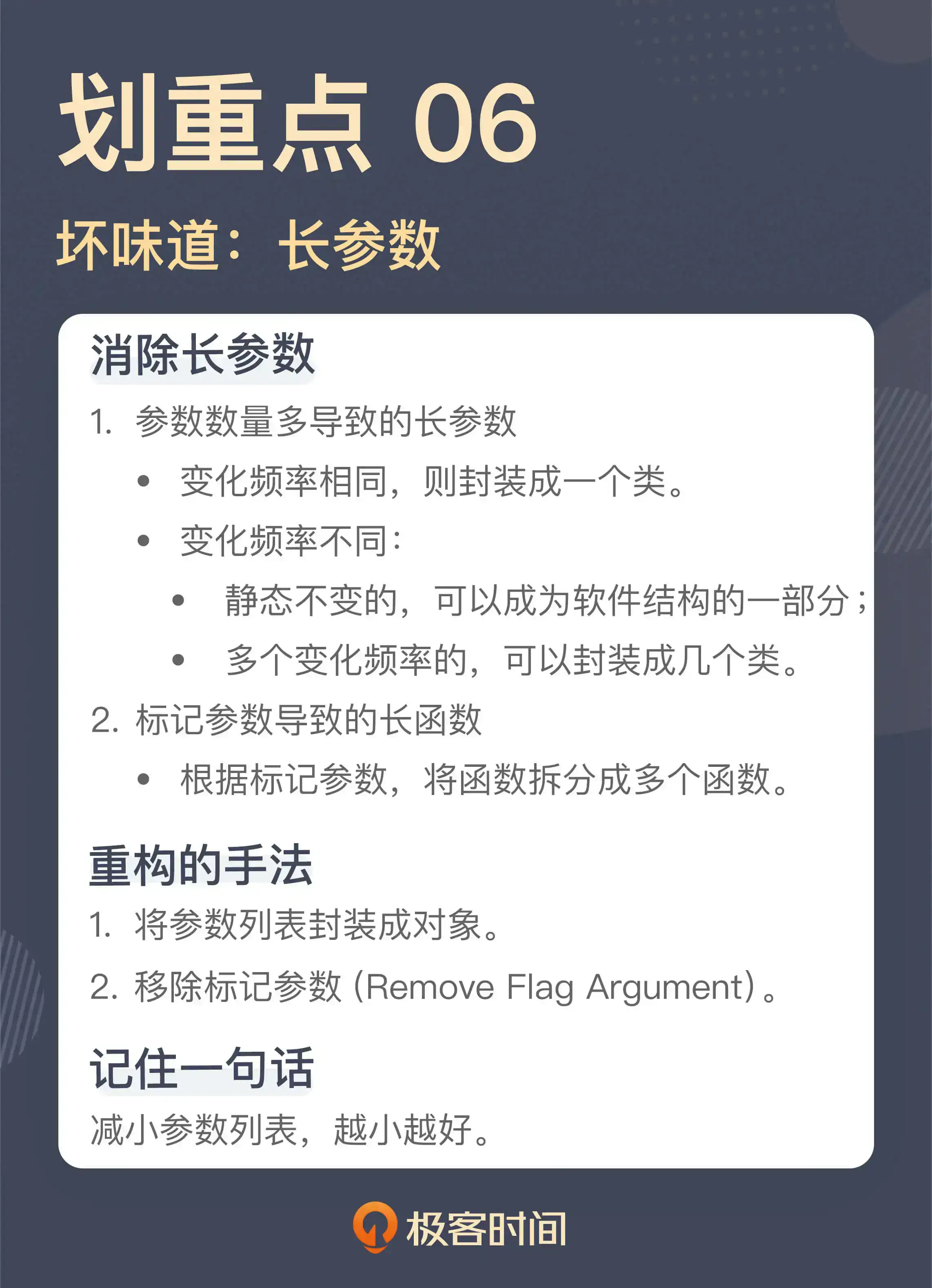 最近这三节课,我们讲了长函数、大类和长参数列表三种不同的坏味道,但在我们阐述了对于这些坏味道的理解之后,仔细想想这些坏味道,其实背后都是一件事:我们应该编写“短小”的代码。