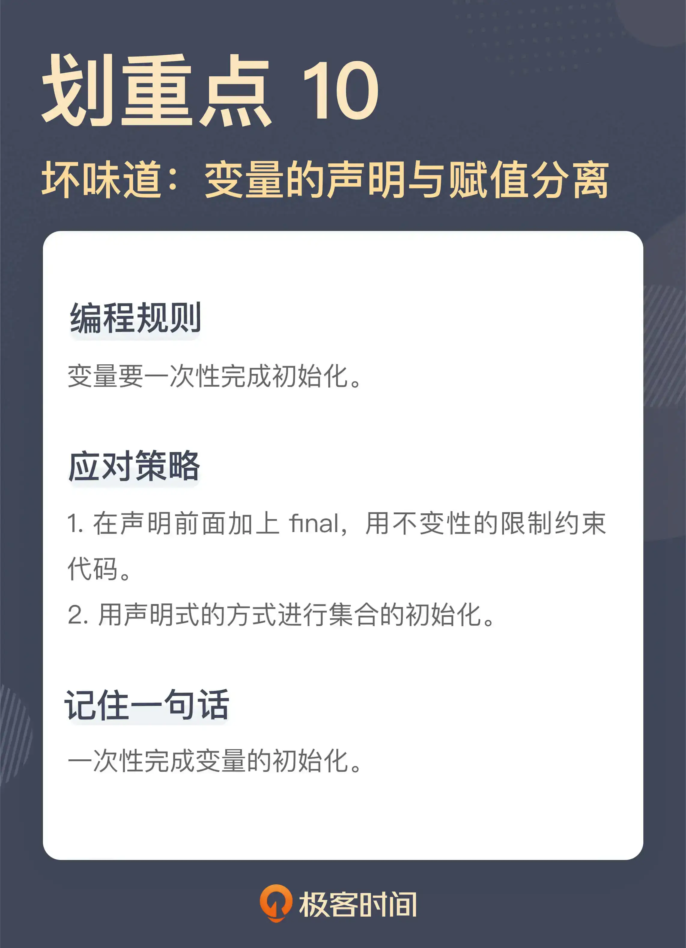 这里说的“能够使用”,不仅包括普通的变量声明,还包含参数声明,还有类字段的声明,甚至还可以包括类和方法的声明。当然,我们这里改进的考量主要还是在变量上。你可以尝试着调整自己现有的代码,给变量声明都加上 final,你就会发现许多值得改进的代码。