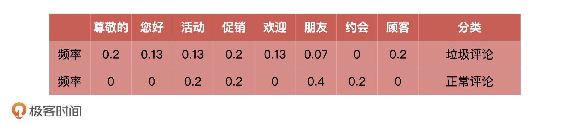 根据刚才得到的表格,我们能够计算出“尊敬的”“你好”这些词语在垃圾评论和正常评论中出现的概率,我把它们总结在了下面的表格里。这个时候,当“顾客”出现在新评论中的,我们就认为它是垃圾评论的概率是 0.2。