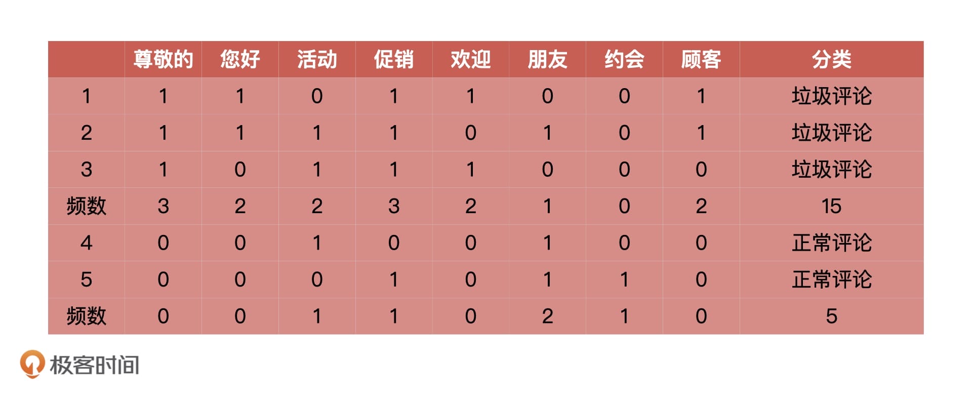 举个例子,如果用户评论中出现某些特定词,比如“尊敬的”“您好”“促销”等等,它们很有可能属于垃圾评论。那我们就可以用这些词来构成“词向量”,具体怎么做呢?下面,我分三步来讲。
