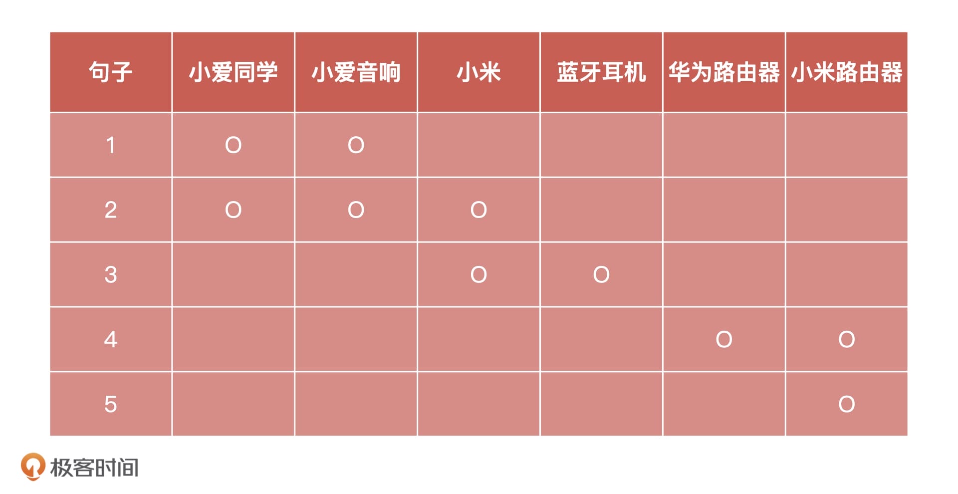 按照这个思路,我把这 5 个句子中含有的名词都整理到了下面的表中,并用 “O” 进行了标记。