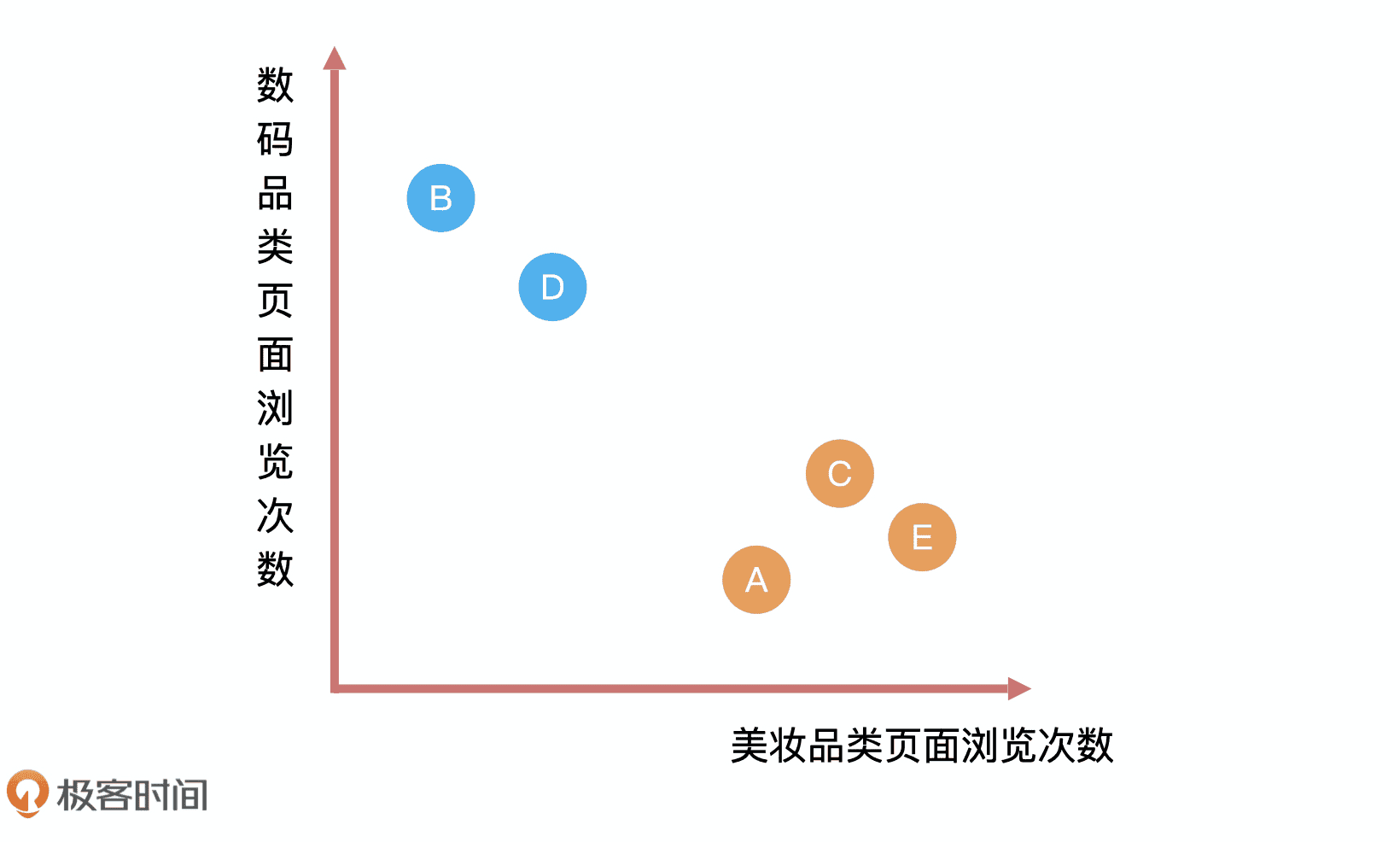 我们可以把性别和浏览页面次数呈现到一个图里,然后将用户浏览美妆品类页面,数码品类页面次数录入。这个时候,你会发现用户 E 和用户 A、C 离得很近,从数学的角度来看,距离越近就越相似,所以我们大概率认为 E 的性别应该和 A、C 一样,是女性。这就是分类问题的解决过程。