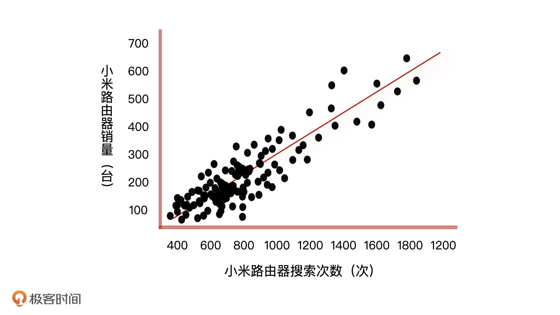 有这样的一个场景,你是一个电商产品经理,你们公司每件商品的库存都是通过预测未来产品的销量来动态调整的。这个功能的实现方式是,先根据商城 App 分析出用户的商品搜索次数,然后将每个商品的搜索次数和销量做数据分析,画出一个横轴为搜索次数,纵轴为销量的二维散点图。