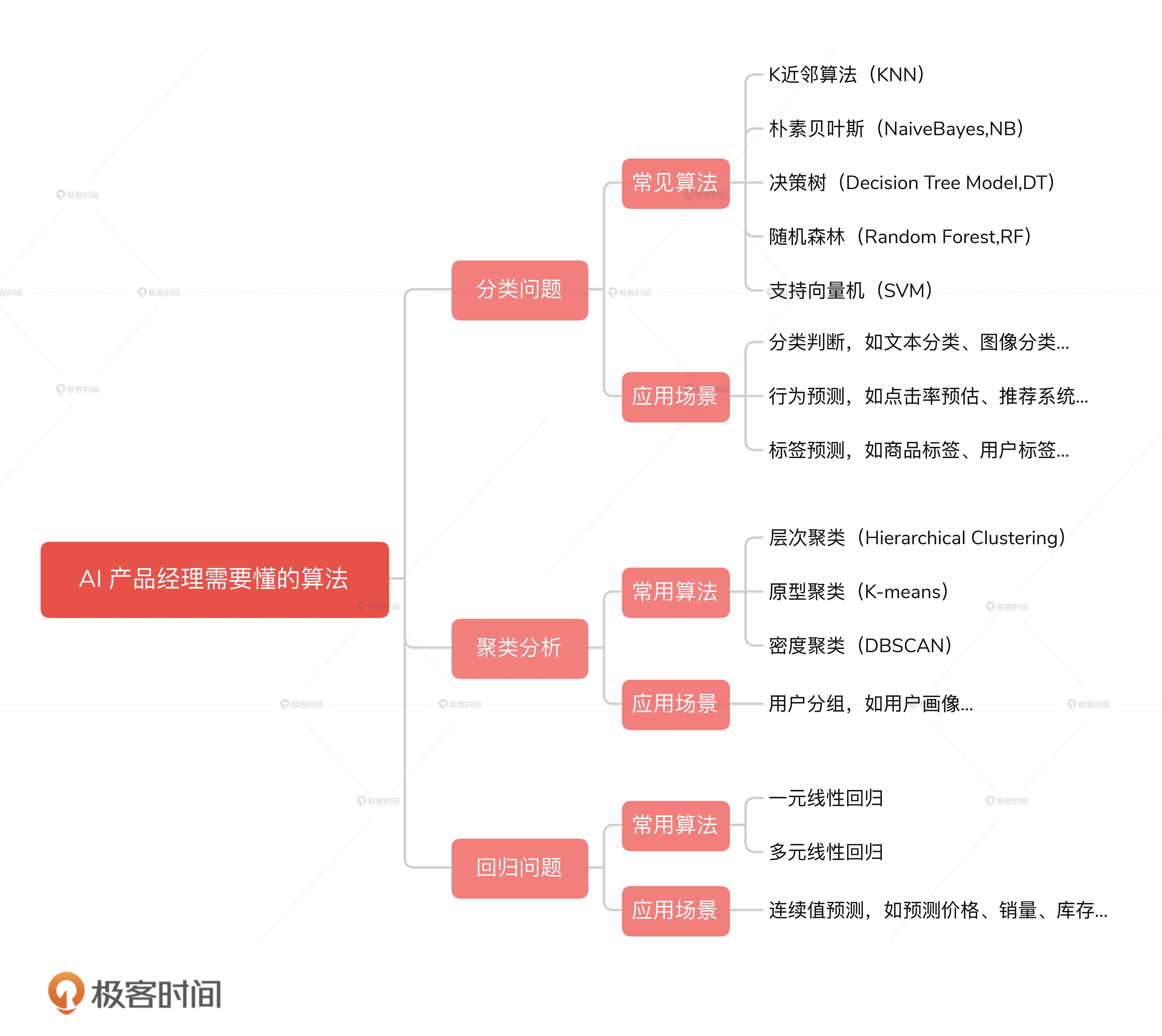 这节课,我会先带你从宏观上了解目前机器学习的三大类应用场景,分别是分类问题、回归问题、聚类问题,以及怎么用相关算法来处理这些问题,最后帮你梳理一张 AI 产品经理需要掌握的算法技术全景图。这样,我们后面再去学习具体的算法,就能有一个更清晰的学习路径了。