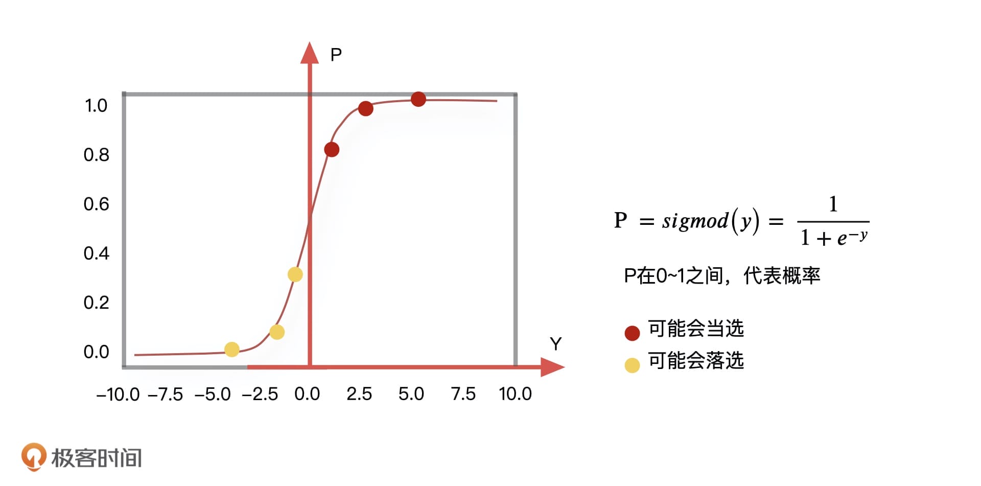 在数学中,我们通常会采取一些平滑函数,去减小这些极端值对于整体分布的影响,让整体的分布更加集中。所谓的平滑函数,你可以理解为是把线性回归预测到的具体的值,通过一个函数转化成为 0~1 的一个概率值,如下图所示。