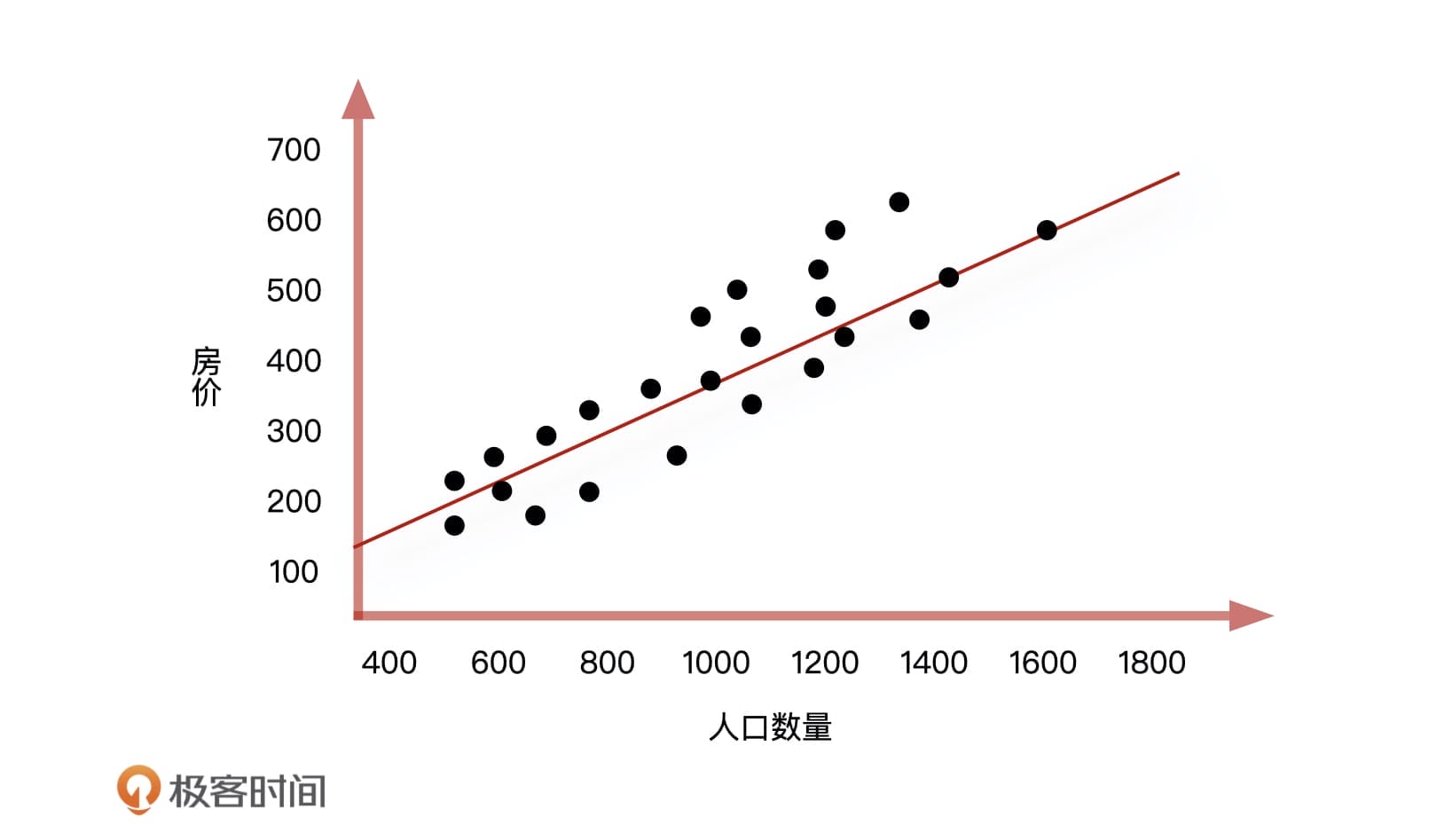 不过,当有两个变量的时候,问题就会更复杂,所以为了方便你理解,我们把这个模型简化一下,先只把“人口数量”这个影响房价的重要特征留下。这样一来,我们根据线性回归算法就能画出一个房价随人口数量变化的图形,它的公式是:房价 = 人口数量 * A + B。