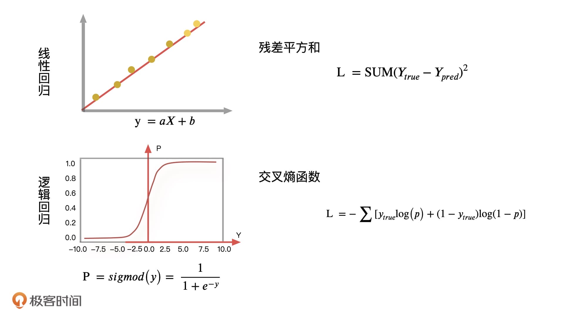 到这儿,我们就把逻辑回归的原理讲完了。不过,我还想再和你聊聊逻辑回归最优解的问题。上节课,我们在计算线性回归最优解的时候,需要找到所有样本点相对于整体分布的距离当作损失函数的评估目标,也就是让线性回归的预测值和真实值之间的差异越小越好。