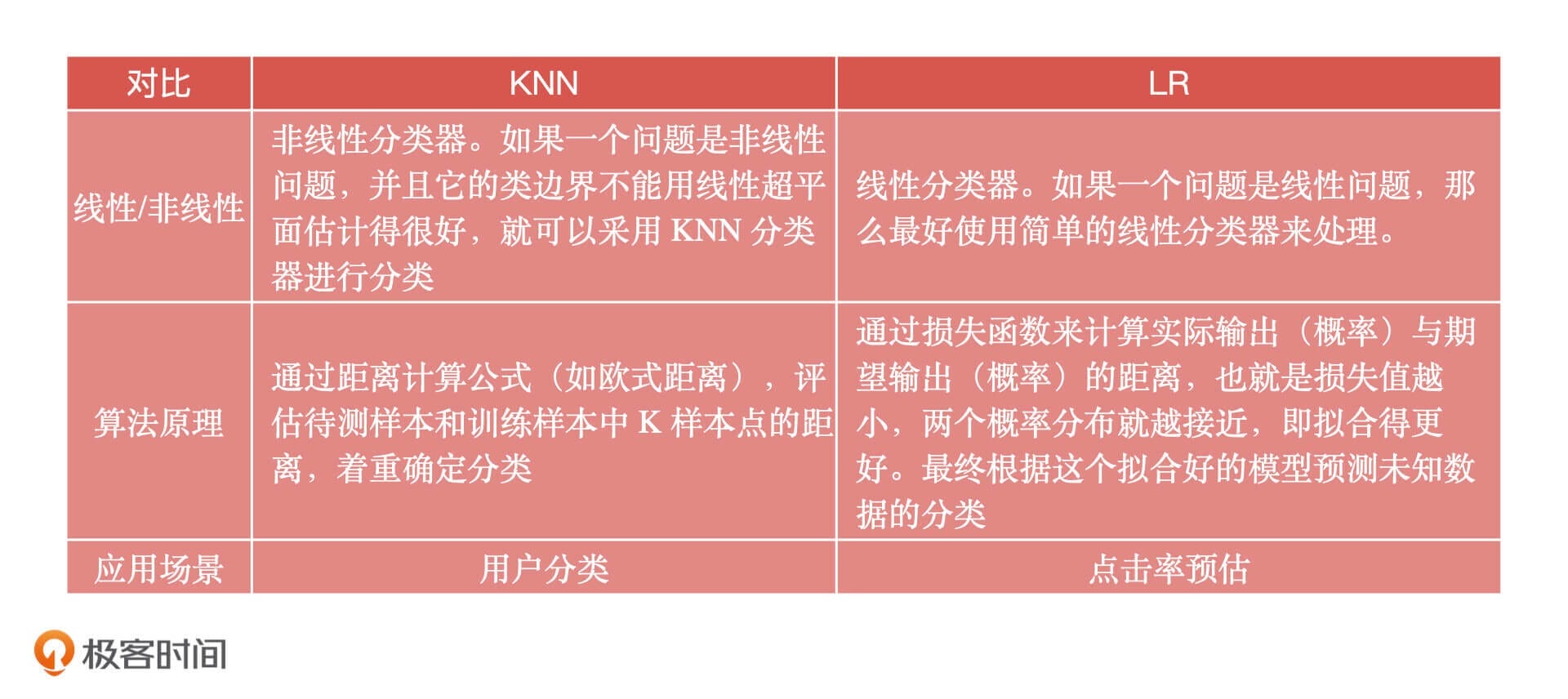 重要知识总结完了之后,我还想说一个额外的问题,我们知道逻辑回归算法和 KNN算法都是分类算法,也都可以解决分类问题,那你知道它们之间的区别吗?你可以先自己想想,为了方便你理解,我把它们之间的对比表格放在了下面,你可以看一看。
