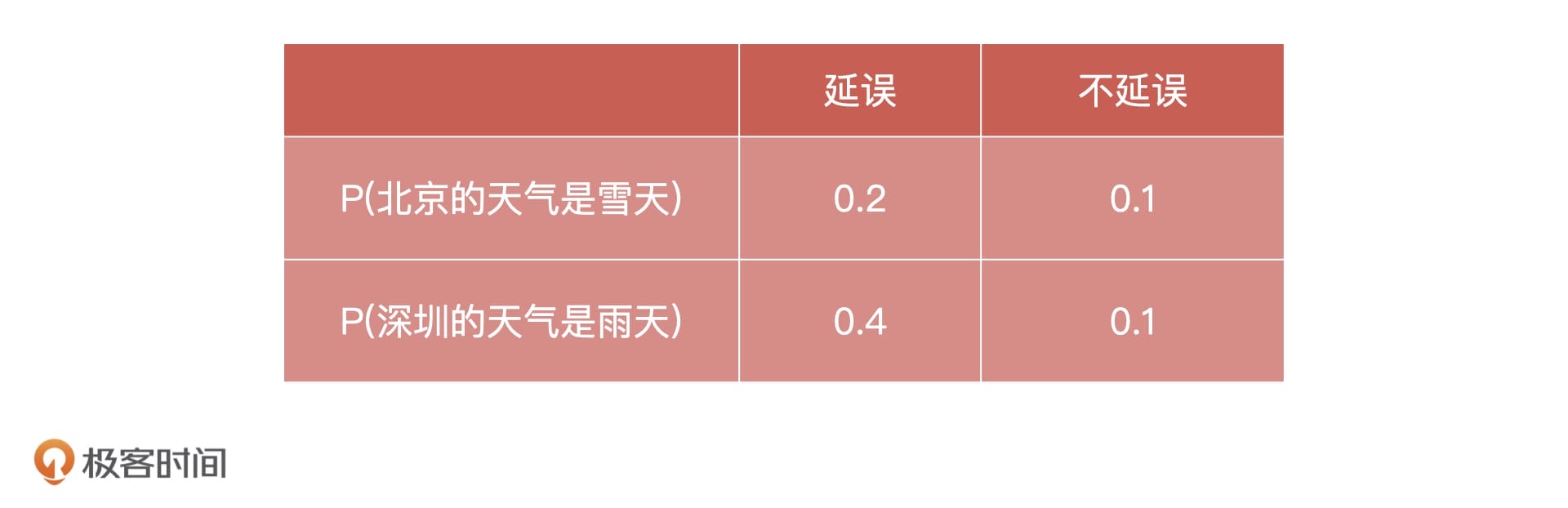 那我们该怎么去判断航班是否可能延误呢?我们可以用朴素贝叶斯快速构建一个模型进行预测。具体的做法是这样的:我们已经知道,决定航班是否延误最主要的因素就是起飞地和降落地的天气情况。假设这些原因之间完全没有影响,那么我们可以去收集过去的飞行数据,计算出每一个条件,比如天气和飞机延误之间的关系。
