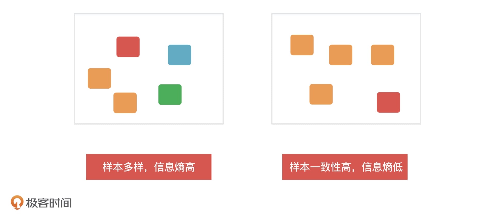 我们一般会在特征选择和决策树的生成阶段,通过信息熵来决定哪些特征重要以及它们应该放到哪个节点上,因为信息熵是用来衡量一个节点内信息的不确定性的。一个系统中信息熵越大,这个系统的不确定性就越大,样本就越多样,你也可以理解成是样本的纯度越低,信息熵越小,系统的不确定性就越小,样本越趋于一致,那样本的纯度就越高