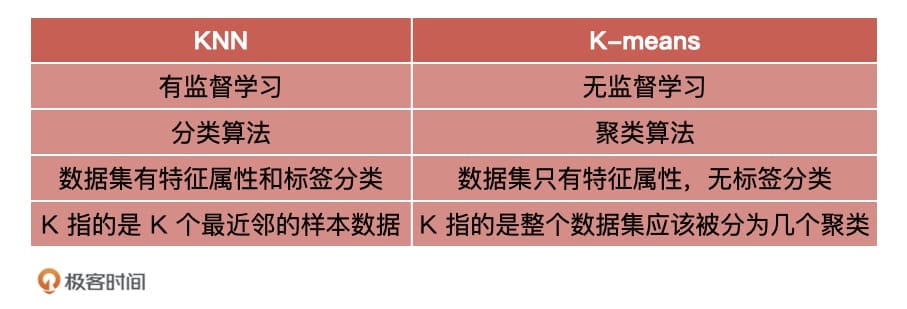 那重要知识总结完之后,我还想带你对K-means算法和KNN 做一个区分。很多同学容易把它们弄混,因为它们的类别信息都会受到当前样本周围的环境的影响,但 K-means和KNN 有着本质的区别,我在下面对它们进行了对比,你可以去看看,希望能帮助你加深理解。