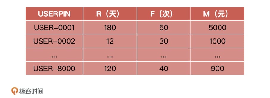 然后,我们通过用户历史数据(如订单数据、浏览日志),统计出每个用户的 RFM 数据: