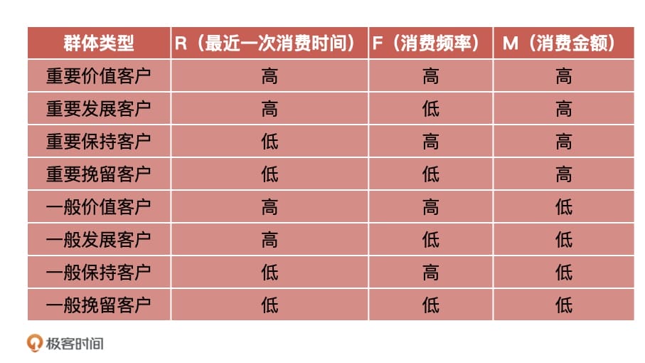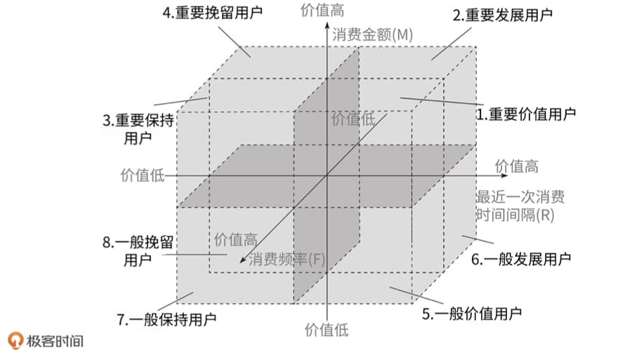 我们可以将每个维度分为高低两种情况,如 R 的高低、F 的高低,以及 M 的高低,构建出一个三维的坐标系。