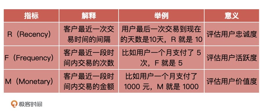 RFM 作为用户价值划分的经典模型,就可以解决这种分群的问题,RFM 是客户分析及衡量客户价值的重要模型之一。其中 ,R 表示最近一次消费(Recency),F 表示消费频率(Frequency),M 表示消费金额(Monetary)。