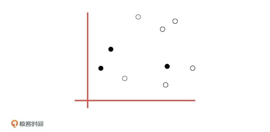 K-means算法是怎么解决聚类问题的呢?为了帮助你理解,我们来举个具体点的例子。假设我们现在要给 9 个样本进行聚类,它们有两个特征维度,分布在一个二维平面上,如下图所示。