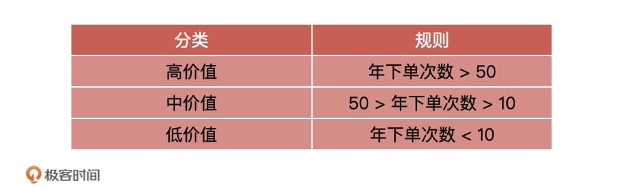 就我知道的情况来说,运营同学经常会按照自己的经验,比如按照用户的下单次数,或者按照用户的消费金额,通过制定的一些分类规则给用户进行分层,如下表格,我们就可以得到三种不同价值的用户。