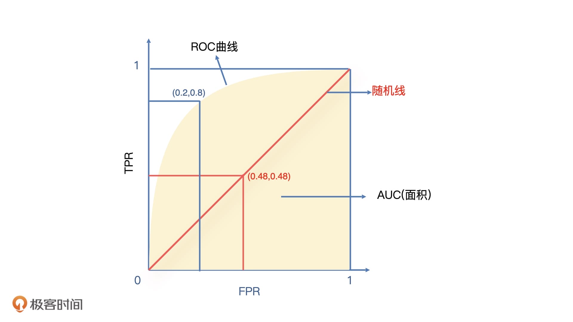 除了蓝线,我们看到图中还有一条红线,它是一条随机线,这条随机线上的每一个切分点的FPR和FPR都是相等的。它表示模型每次切分时,抓到坏人的概率和误伤好人的概率都是一样的。这和我们随机猜测的概率相同,所以模型的ROC曲线越贴近这条随机线,模型的分类效果就越差。甚至,如果ROC曲线在随机线下面,就说明模型预测结果和我们预期结果是反的,而当ROC曲线越偏离随机线并且靠近左上方(0,1)点的时候,说明模型分类效果越好,因为这个时候,模型的TPR=1,FPR=0。