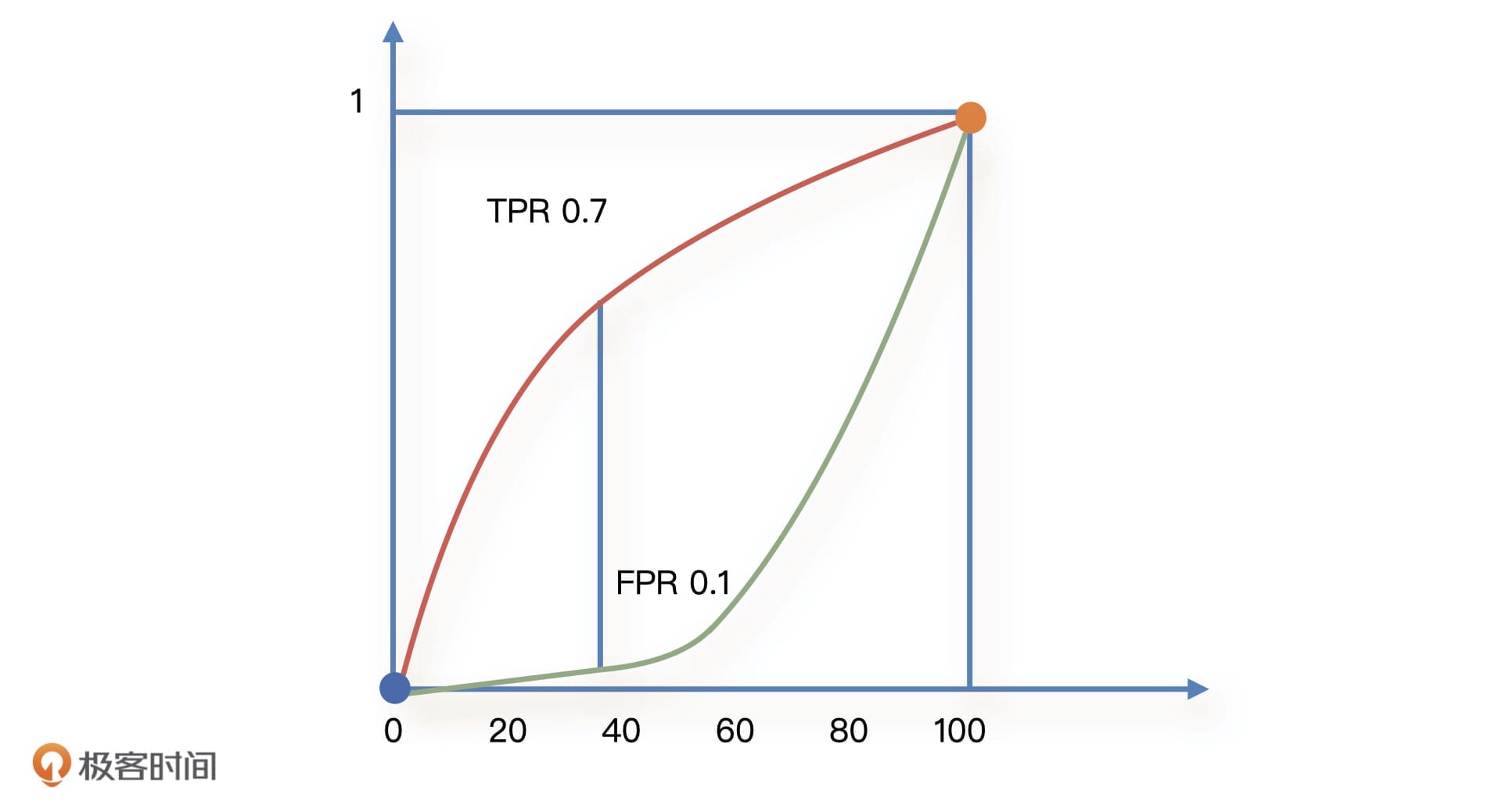 如下图所示,红色线是我们在不同的切分点得到的所有TPR的曲线,绿色线是相应的FPR曲线。它们在(0,0)和(100,1)这两个点相交。
