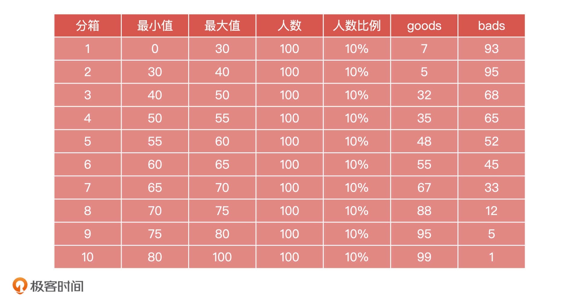 在这里,我想请你尝试手动计算一下KS值。虽然实际工作中我们不需要手工计算,但是我希望你可以通过本次课后题,加深对KS的理解。