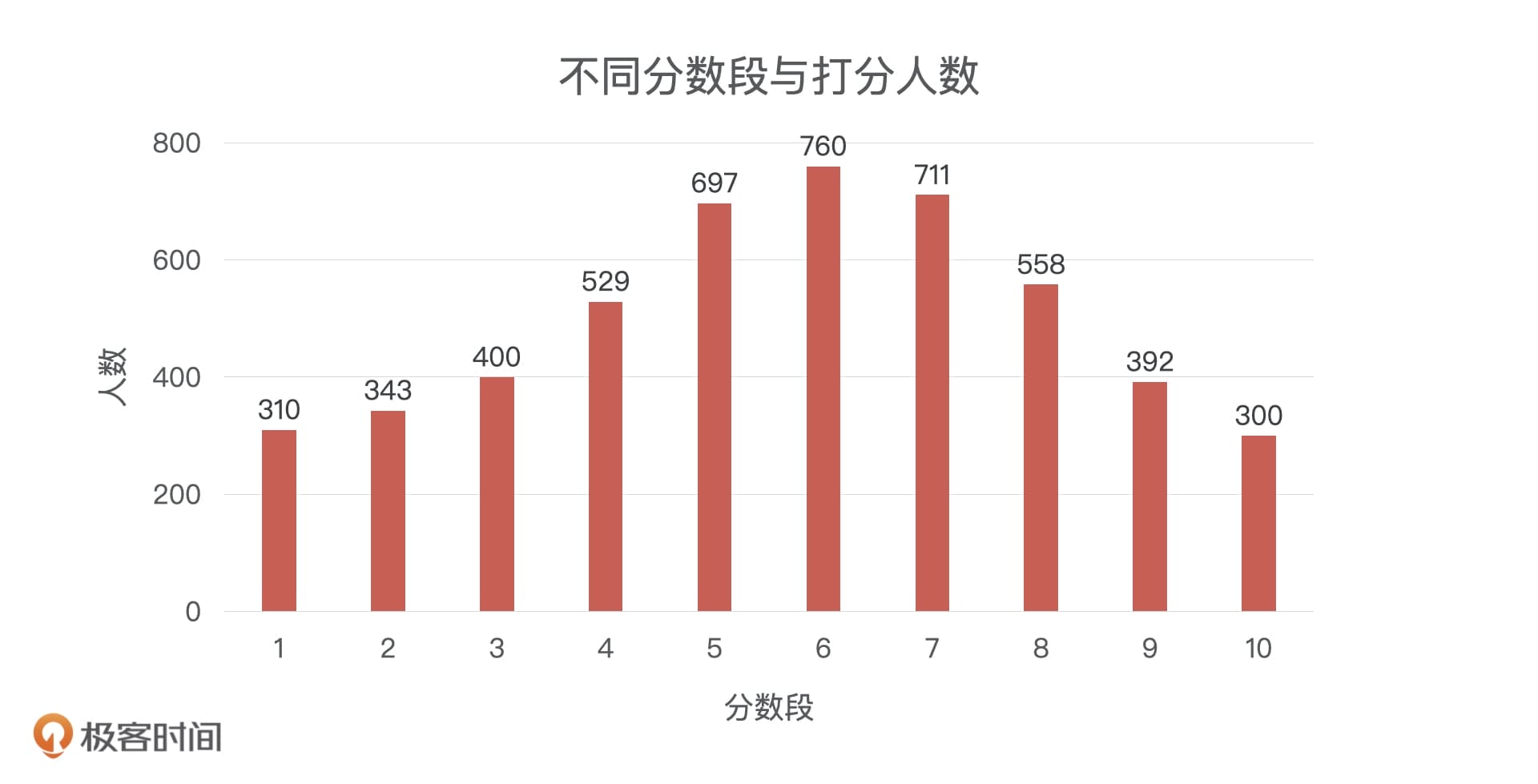 如果我们没有这个阈值呢?实际上,我们在模型分数的每一个点上都可以做这样的划分(也就是把每一个分数点都当作是一个阈值),这样就可以得到一连串的指标。想想都知道,对所有分数进行划分会非常麻烦。虽然不能对所有分数进行划分,但是我们可以对分数进行分段处理。比如说,我们的打分人数有5000人,我们按照每10分进行一个分段,就能得到下面这张图。