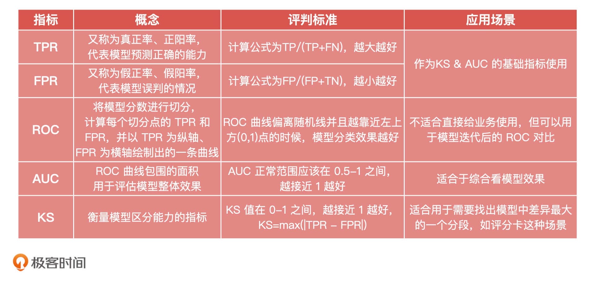这节课,我们讲了分类模型评估的进阶指标:KS和AUC,它们是我们在模型评估中用得比较多的指标。围绕它们的构建,我们又讲了TPR、FPR和ROC曲线,为了方便你记忆和对比,我把它们的核心概念、公式适用场景都总结在了下面的表格中,你可以看看。