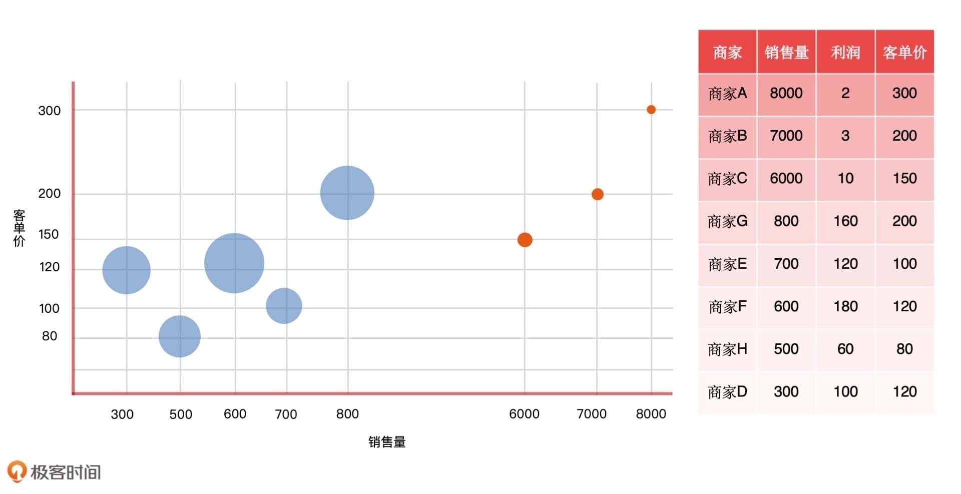 假设,你们公司是一家电商平台,入驻的商家可以在平台上卖货,平台会按照佣金比例进行分成。下图就是你们公司和商家分成的波士顿距阵图(BCG Matrix,波士顿咨询集团规划产品的一种方法,旨在体现企业产品品种以及结构适合市场需求的变化),其中横轴代表商家在平台上的销售量,纵轴代表商家在平台上的平均客单价,圆圈大小代表商家给平台带来的利润高低。
