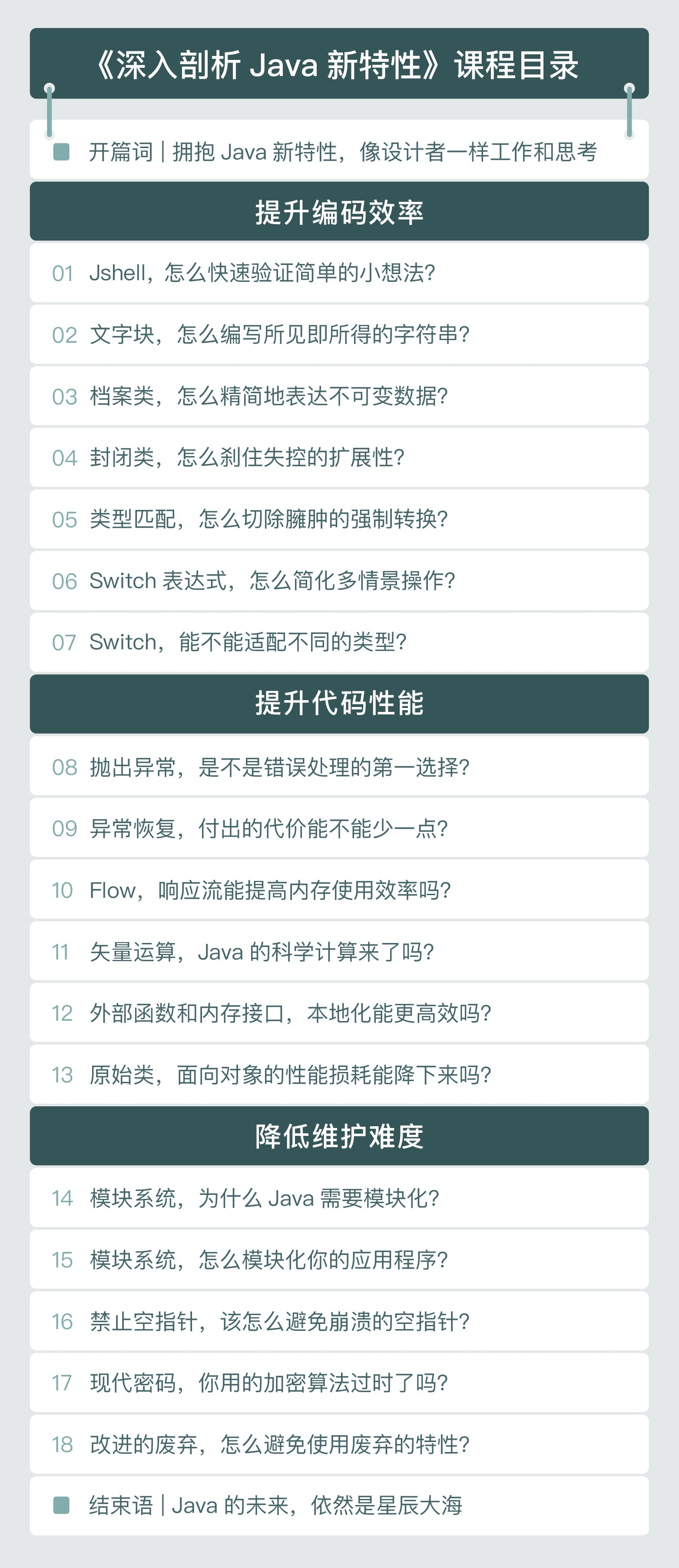 好了,今天的内容就先到这里。也期待你可以在留言区和我聊聊,你对这门课的期待,以及你在学习Java新特性时的经历。接下来,让我们正式开始学习Java语言,开启这段打怪升级的旅程吧!