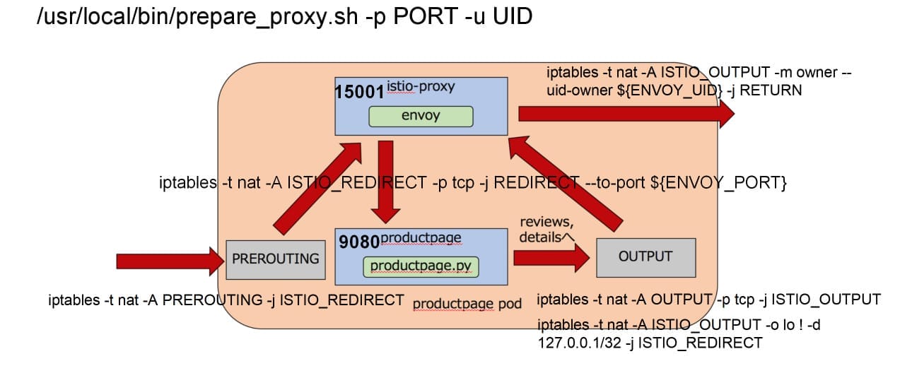 接下来,在PREROUTING规则中使用这个转发链。从而,进入容器的所有流量都被先转发到envoy的15000端口。而envoy作为一个代理,已经被配置好了,将请求转发给productpage程序。