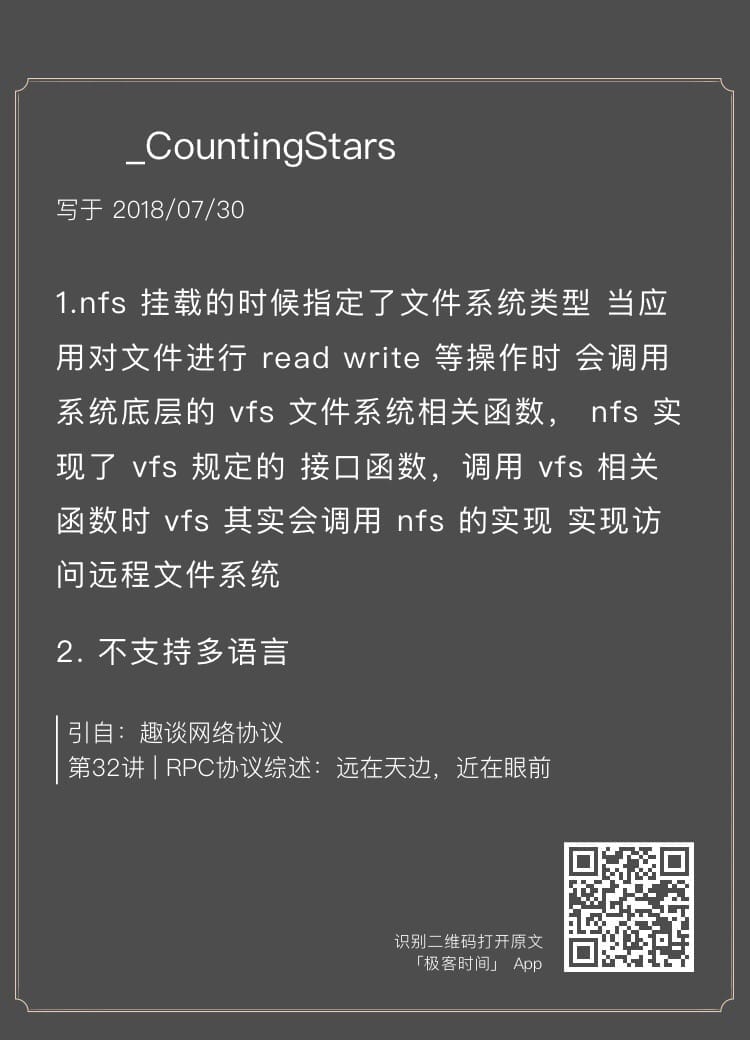 对于Socket来讲,in-core inode就是内存中的inode。对于nfs来讲,也有一个inode,这个inode里面有一个成员变量file_operations,这里面是这个文件系统的操作函数。对于nfs来讲,因为有nfs_file_read、nfs_file_write,所以在一个mount的路径中读取某个文件的时候,就会调用这两个函数,触发RPC,远程调用服务端。