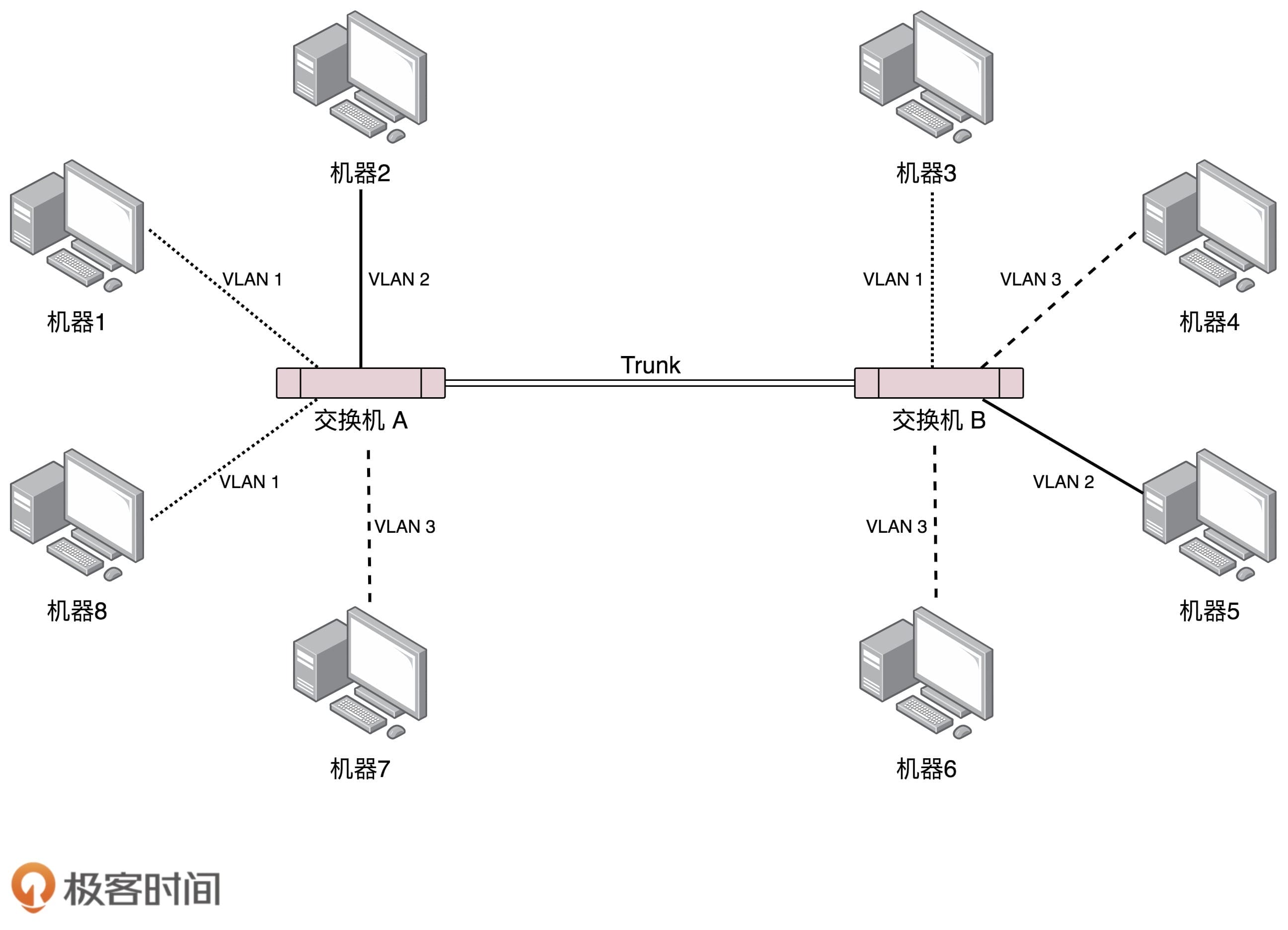 有人会问交换机之间怎么连接呢?将两个交换机连接起来的口应该设置成什么VLAN呢?对于支持VLAN的交换机,有一种口叫作Trunk口。它可以转发属于任何VLAN的口。交换机之间可以通过这种口相互连接。