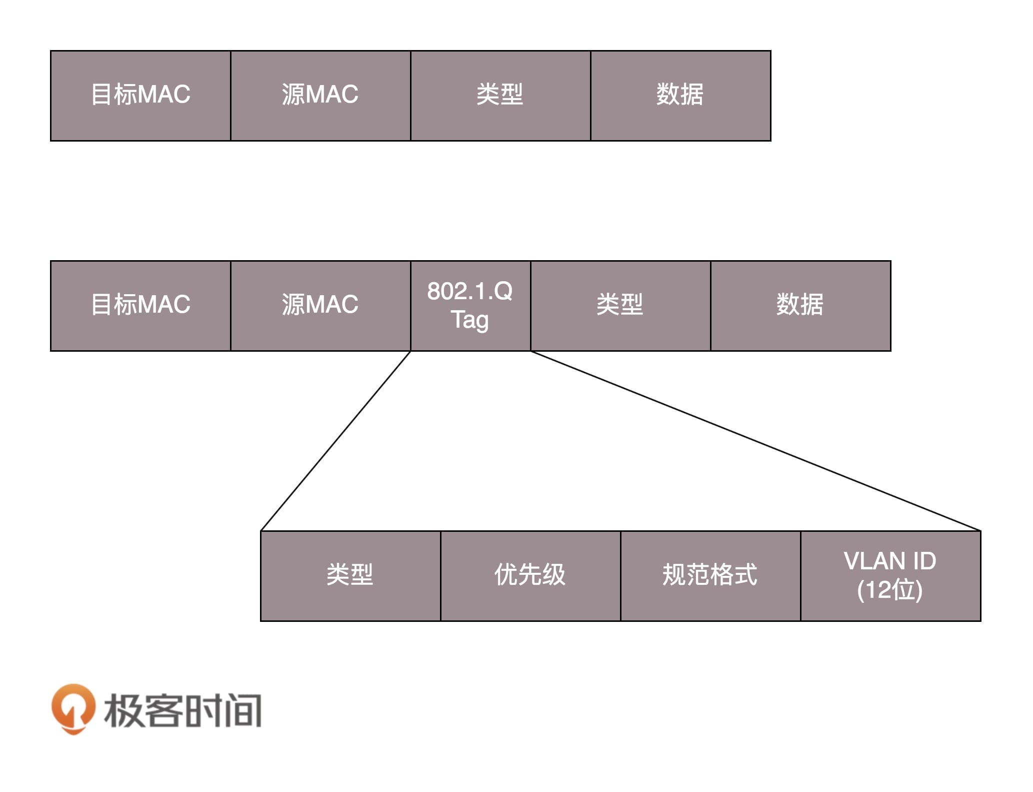 如果我们买的交换机是支持VLAN的,当这个交换机把二层的头取下来的时候,就能够识别这个VLAN ID。这样只有相同VLAN的包,才会互相转发,不同VLAN的包,是看不到的。这样广播问题和安全问题就都能够解决了。-