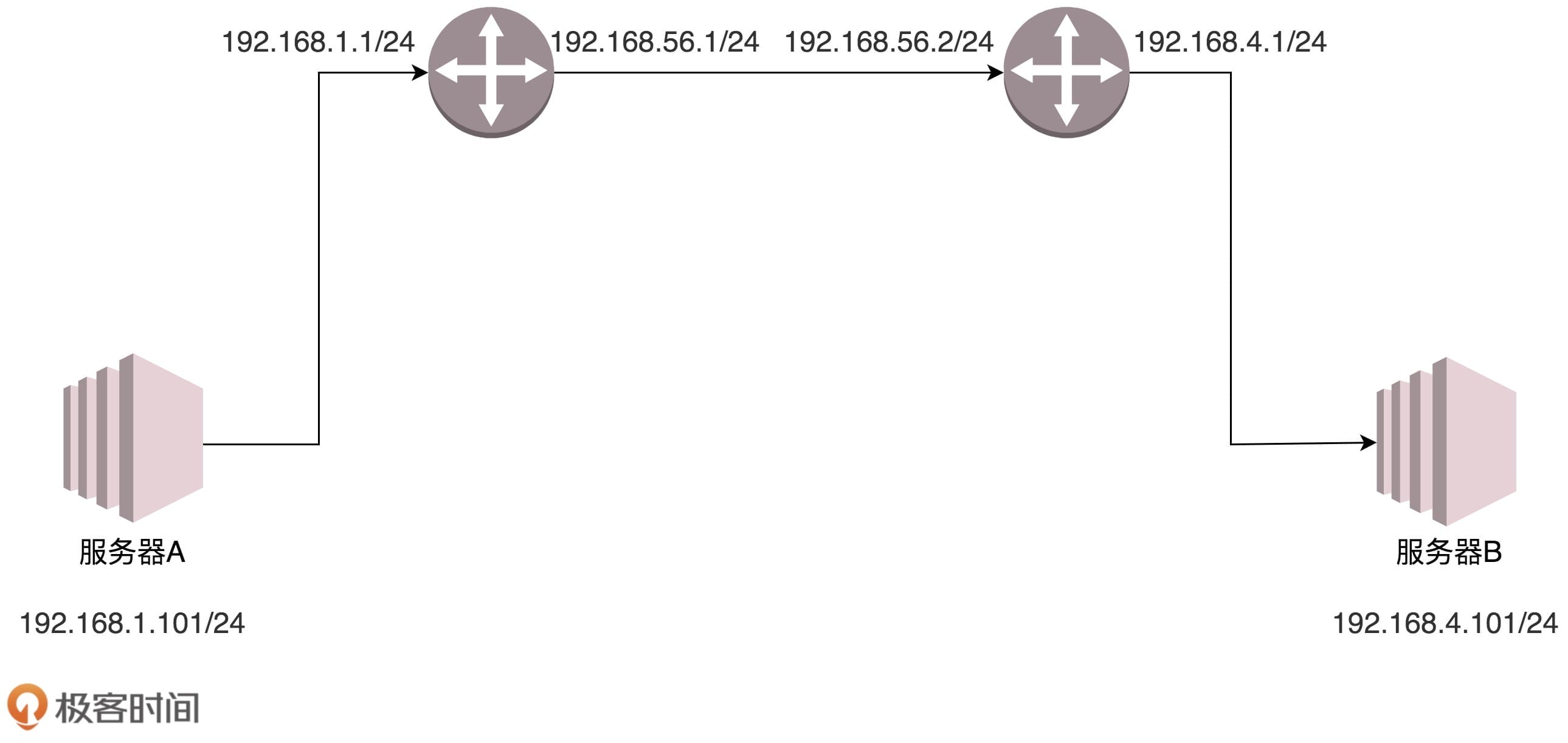 于是,路由器A思考的时候,匹配上了这条路由,要从192.168.56.1这个口发出去,发给192.168.56.2。那192.168.56.2的MAC地址是多少呢?路由器A发送ARP获取192.168.56.2的MAC地址。