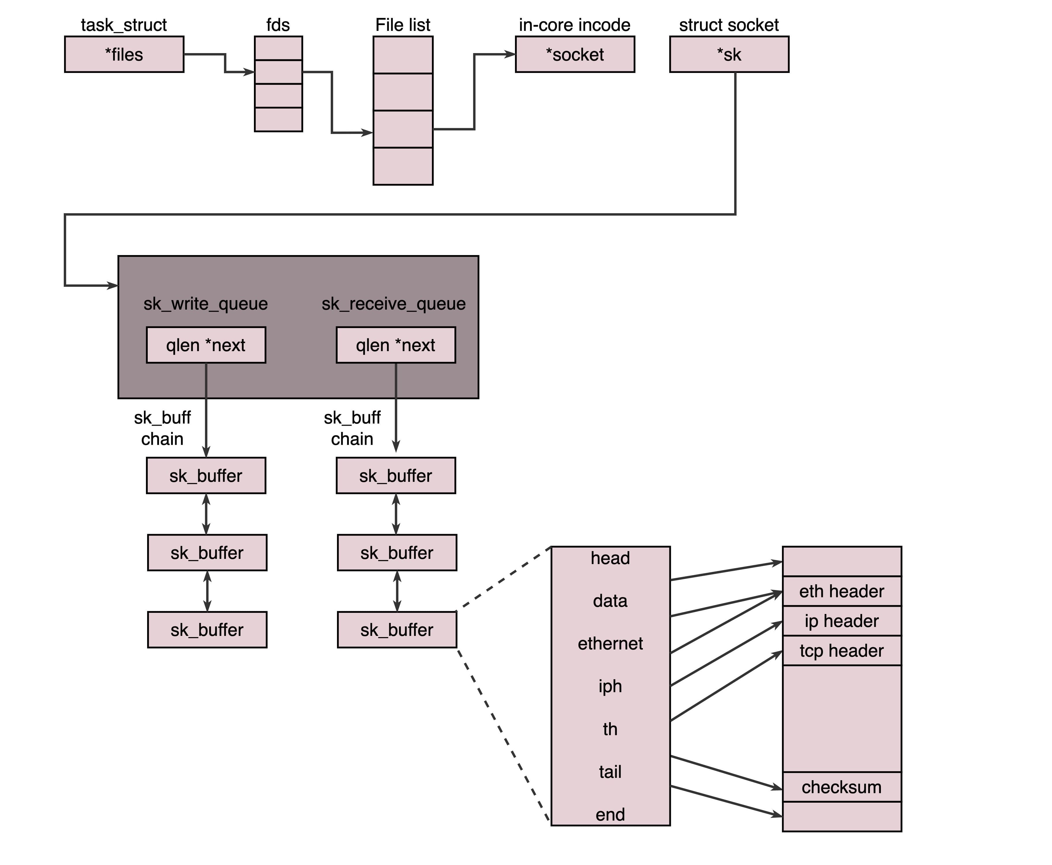 这个数组中的内容是一个指针,指向内核中所有打开的文件的列表。既然是一个文件,就会有一个inode,只不过Socket对应的inode不像真正的文件系统一样,保存在硬盘上的,而是在内存中的。在这个inode中,指向了Socket在内核中的Socket结构。