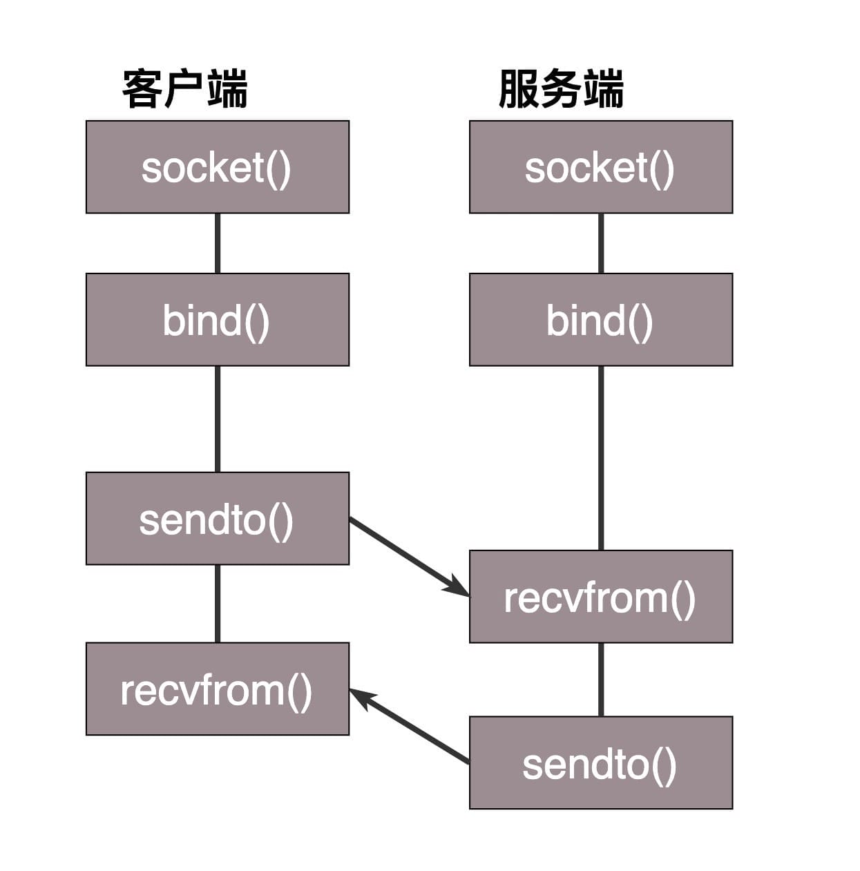 对于UDP来讲,过程有些不一样。UDP是没有连接的,所以不需要三次握手,也就不需要调用listen和connect,但是,UDP的交互仍然需要IP和端口号,因而也需要bind。UDP是没有维护连接状态的,因而不需要每对连接建立一组Socket,而是只要有一个Socket,就能够和多个客户端通信。也正是因为没有连接状态,每次通信的时候,都调用sendto和recvfrom,都可以传入IP地址和端口。