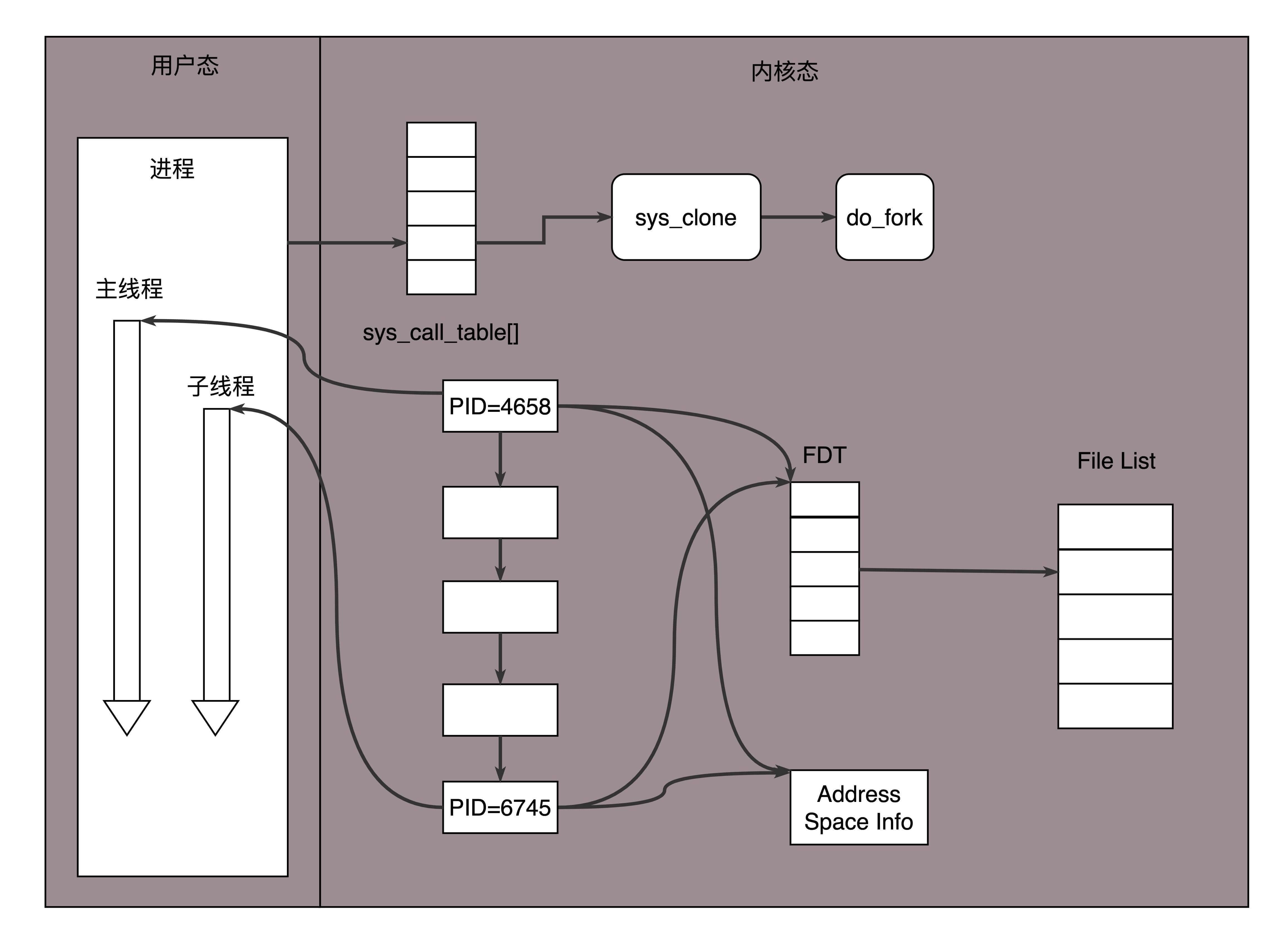 在Linux下,通过pthread_create创建一个线程,也是调用do_fork。不同的是,虽然新的线程在task列表会新创建一项,但是很多资源,例如文件描述符列表、进程空间,还是共享的,只不过多了一个引用而已。