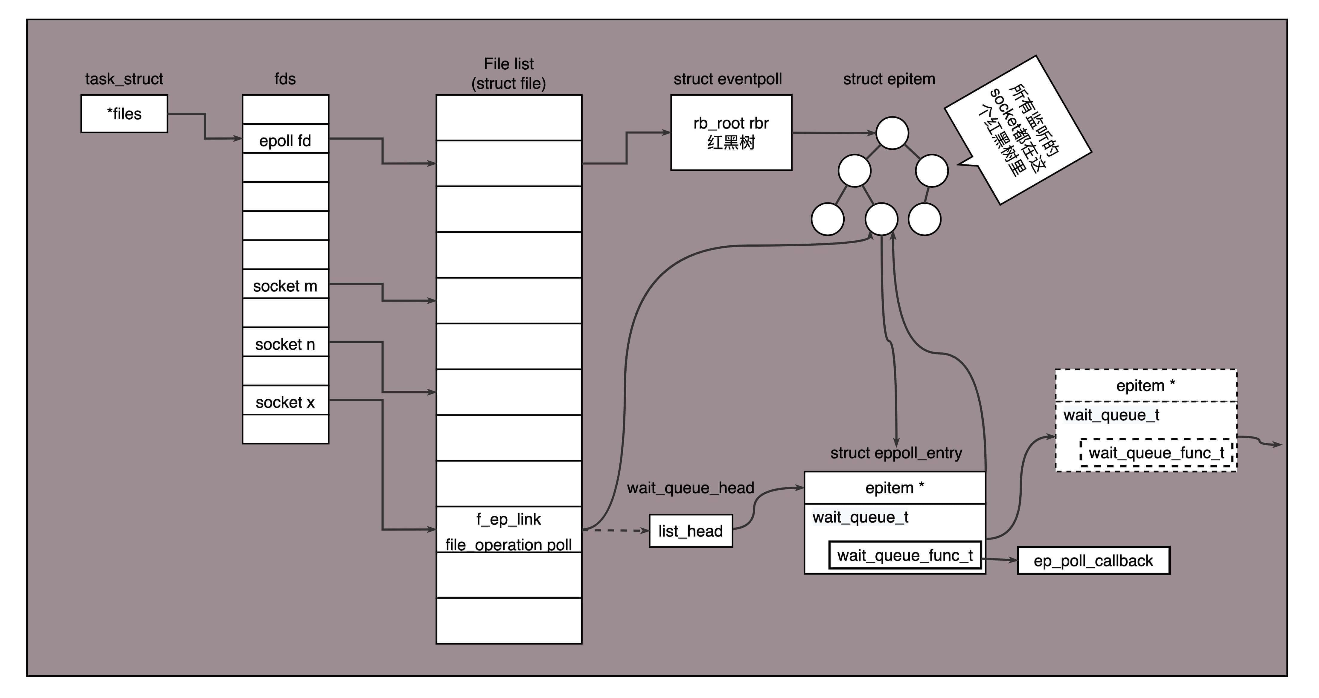 当epoll_ctl添加一个Socket的时候,其实是加入这个红黑树,同时红黑树里面的节点指向一个结构,将这个结构挂在被监听的Socket的事件列表中。当一个Socket来了一个事件的时候,可以从这个列表中得到epoll对象,并调用call back通知它。