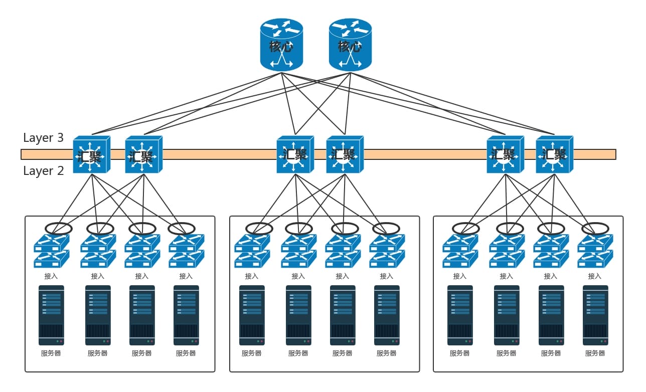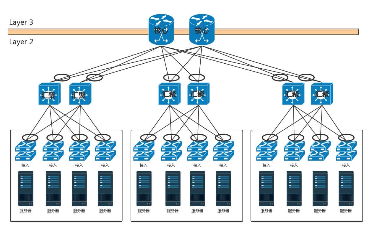 数据中心分为三层。服务器连接到接入层,然后是汇聚层,再然后是核心层,最外面是边界路由器和安全设备。