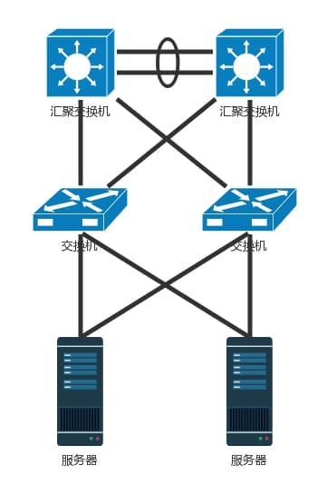 网卡有了高可用保证,但交换机还有问题。如果一个机架只有一个交换机,它挂了,那整个机架都不能上网了。因而TOR交换机也需要高可用,同理接入层和汇聚层的连接也需要高可用性,也不能单线连着。