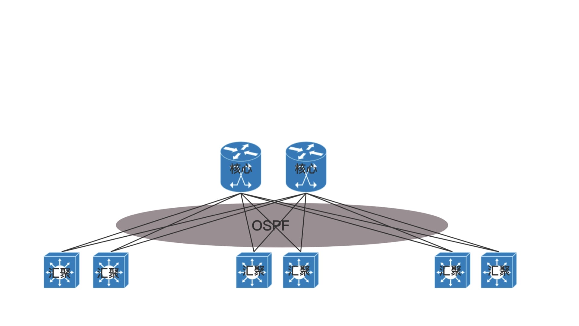 如图,核心层和汇聚层之间通过内部的路由协议OSPF,找到最佳的路径进行访问,而且还可以通过ECMP等价路由,在多个路径之间进行负载均衡和高可用。