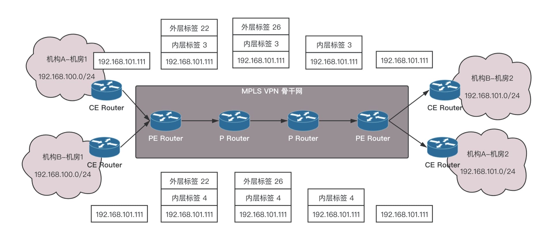机构A和机构B都发出一个目的地址为192.168.101.0/24的IP报文,分别由各自的CE将报文发送至PE。