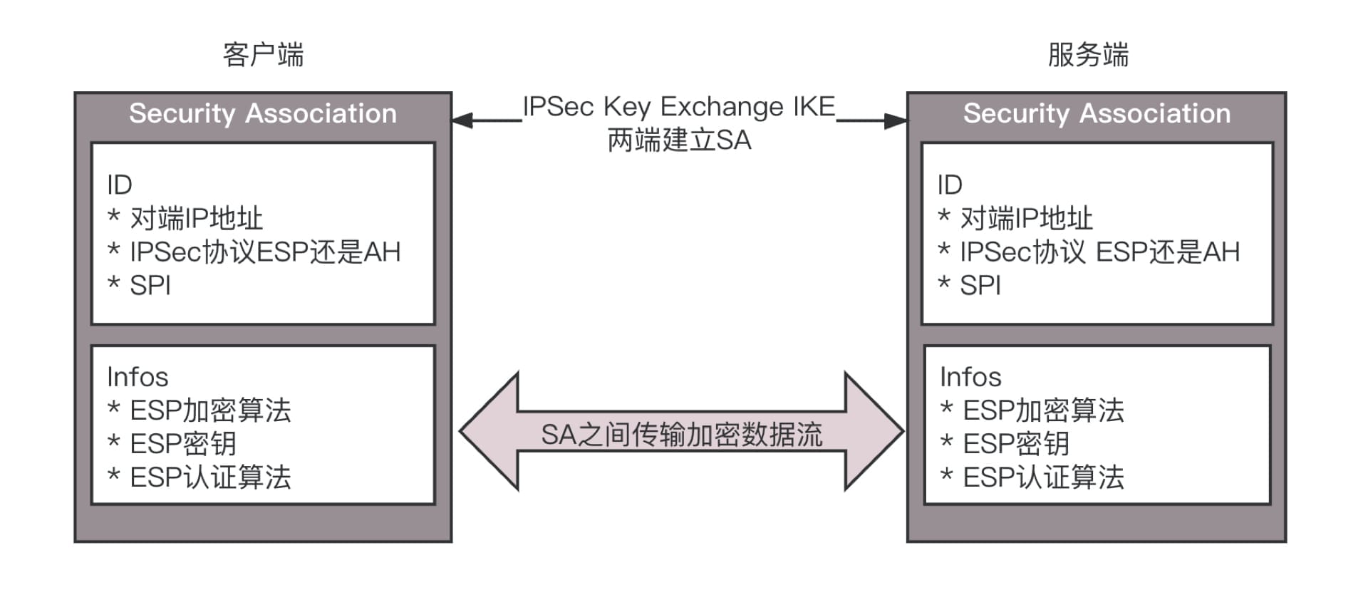 这个协议簇还包含两大组件,一个用于VPN的双方要进行对称密钥的交换的IKE组件,另一个是VPN的双方要对连接进行维护的SA(Security Association)组件。