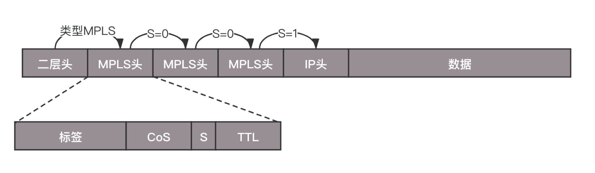 有没有一种方式将两者的优点结合起来呢?这就是多协议标签交换(MPLS,Multi-Protocol Label Switching)。MPLS的格式如图所示,在原始的IP头之外,多了MPLS的头,里面可以打标签。