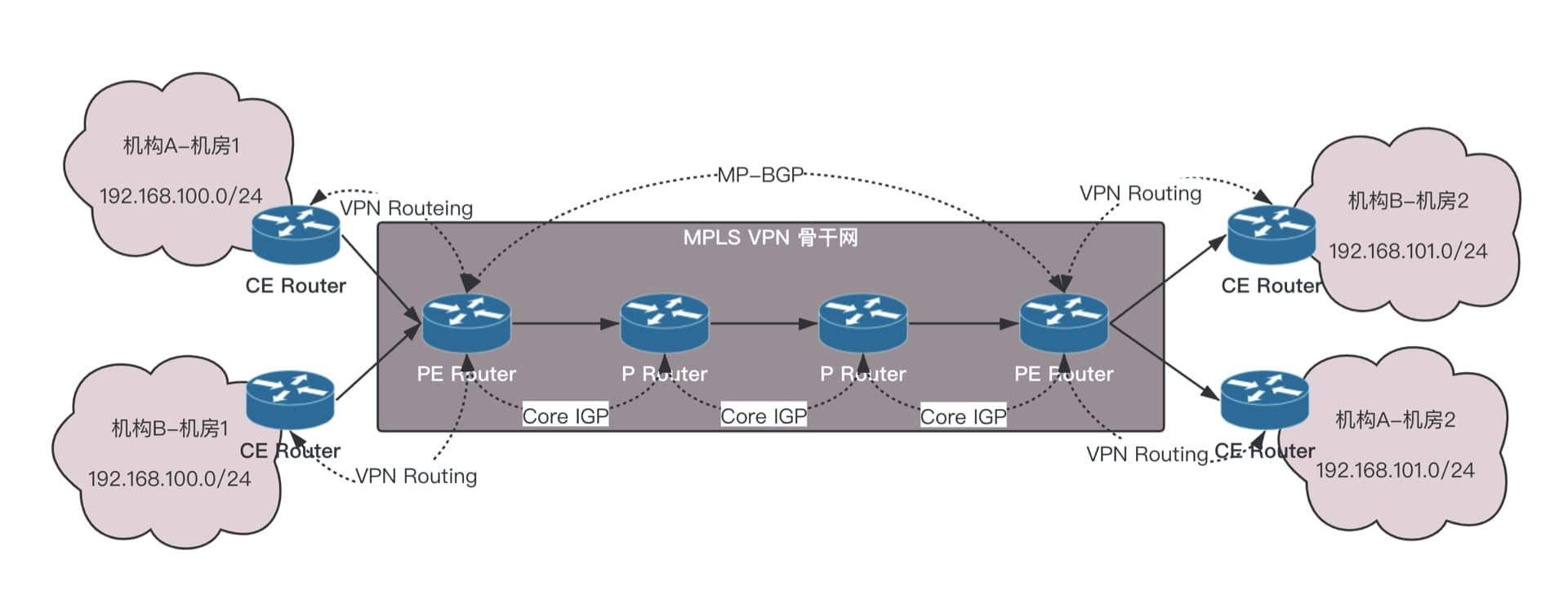 所以PE路由器之间使用特殊的MP-BGP来发布VPN路由,在相互沟通的消息中,在一般32位IPv4的地址之前加上一个客户标示的区分符用于客户地址的区分,这种称为VPN-IPv4地址族,这样PE路由器会收到如下的消息,机构A的192.168.101.0/24应该往这面走,机构B的192.168.101.0/24则应该去另外一个方向。