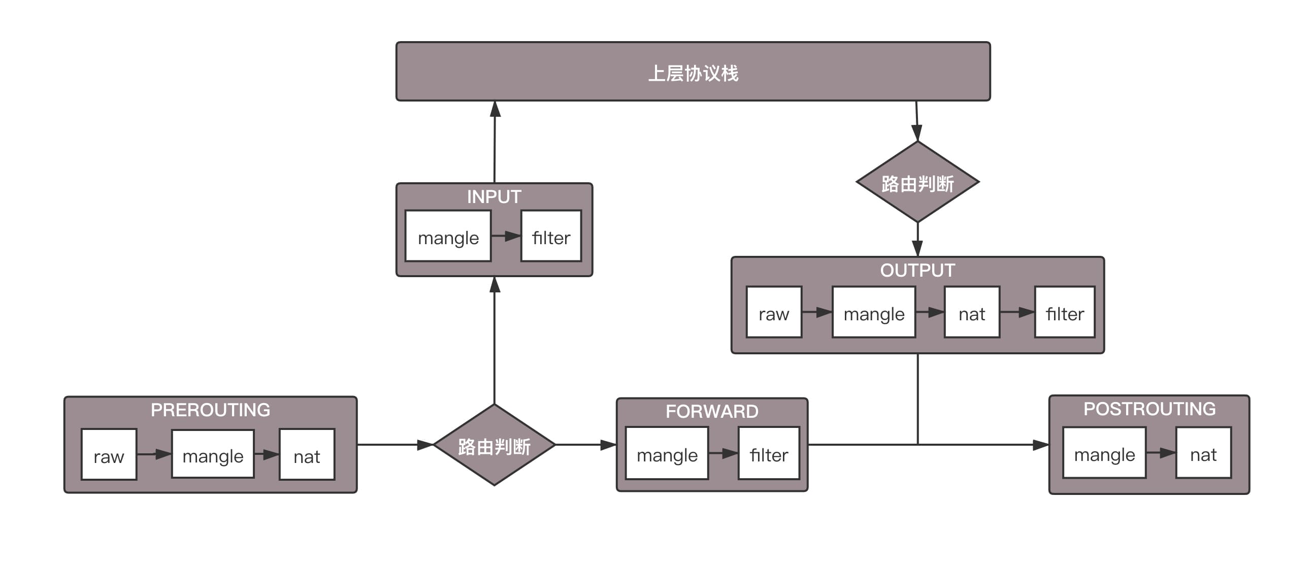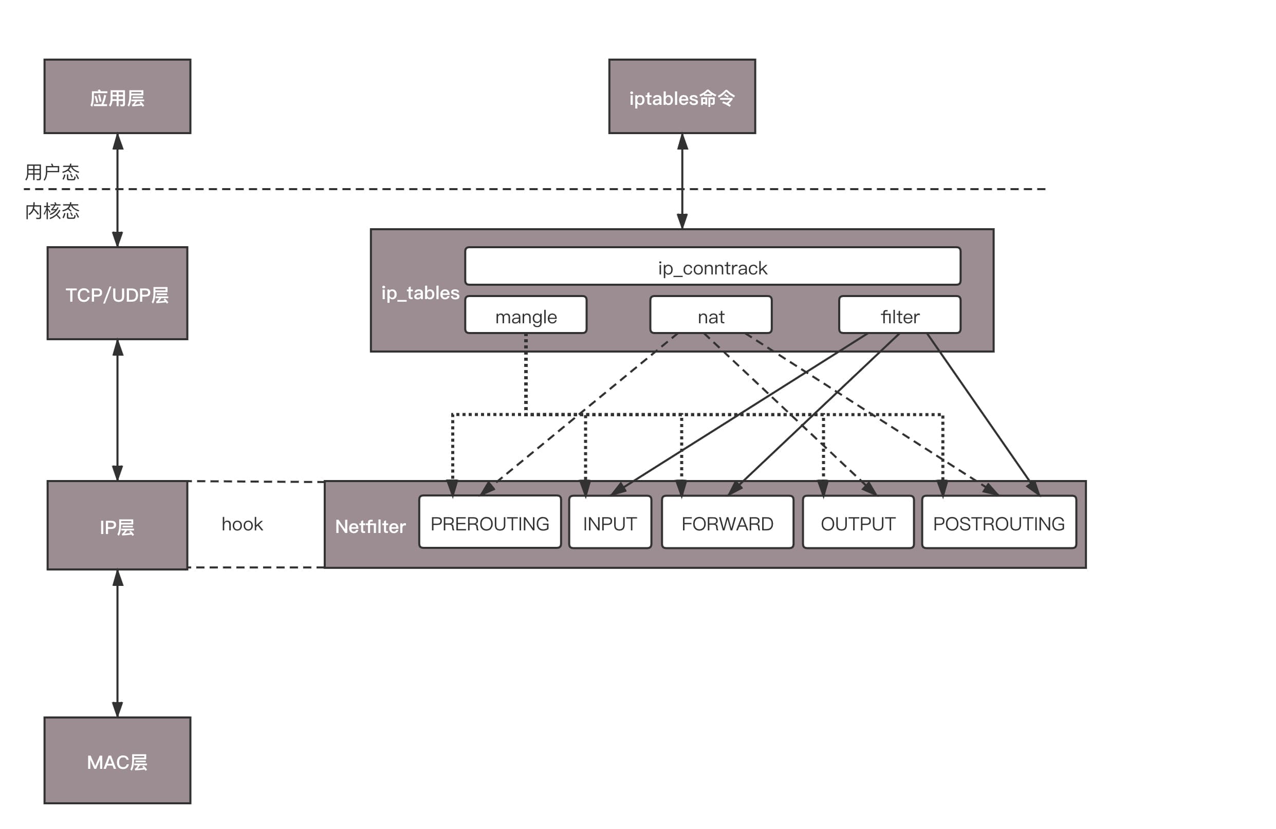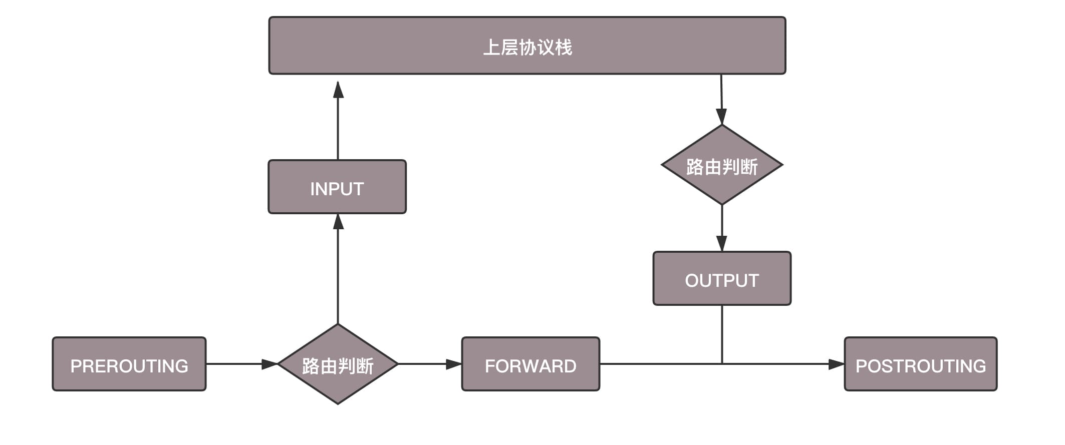 首先拿下MAC头看看,是不是我的。如果是,则拿下IP头来。得到目标IP之后呢,就开始进行路由判断。在路由判断之前,这个节点我们称为PREROUTING。如果发现IP是我的,包就应该是我的,就发给上面的传输层,这个节点叫作INPUT。如果发现IP不是我的,就需要转发出去,这个节点称为FORWARD。如果是我的,上层处理完毕后,一般会返回一个处理结果,这个处理结果会发出去,这个节点称为OUTPUT,无论是FORWARD还是OUTPUT,都是路由判断之后发生的,最后一个节点是POSTROUTING。