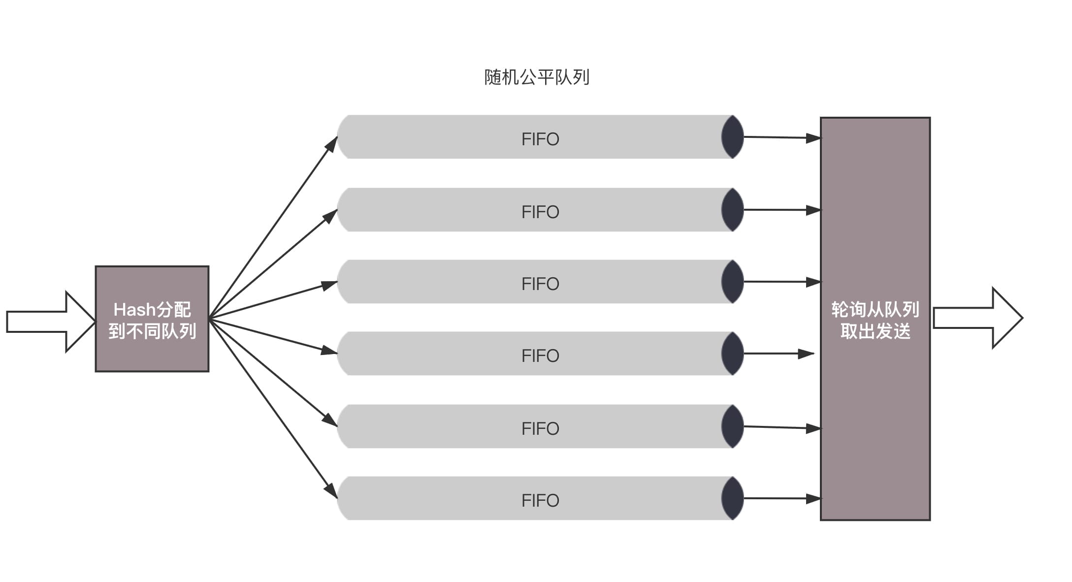 会建立很多的FIFO的队列,TCP Session会计算hash值,通过hash值分配到某个队列。在队列的另一端,网络包会通过轮询策略从各个队列中取出发送。这样不会有一个Session占据所有的流量。