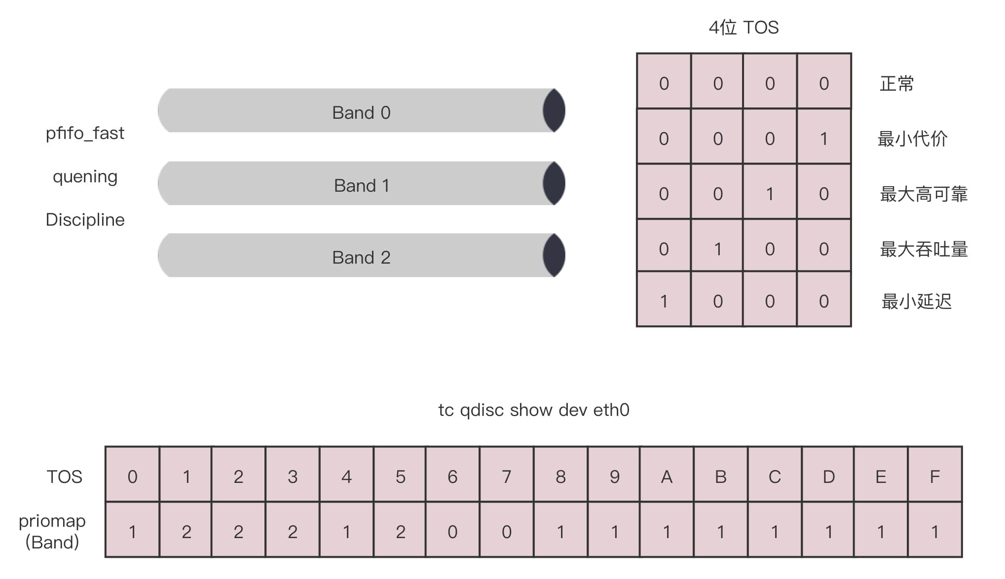 通过命令行tc qdisc show dev eth0,可以输出结果priomap,也是十六个数字。在0到2之间,和TOS的十六种类型对应起来,表示不同的TOS对应的不同的队列。其中Band 0优先级最高,发送完毕后才轮到Band 1发送,最后才是Band 2。