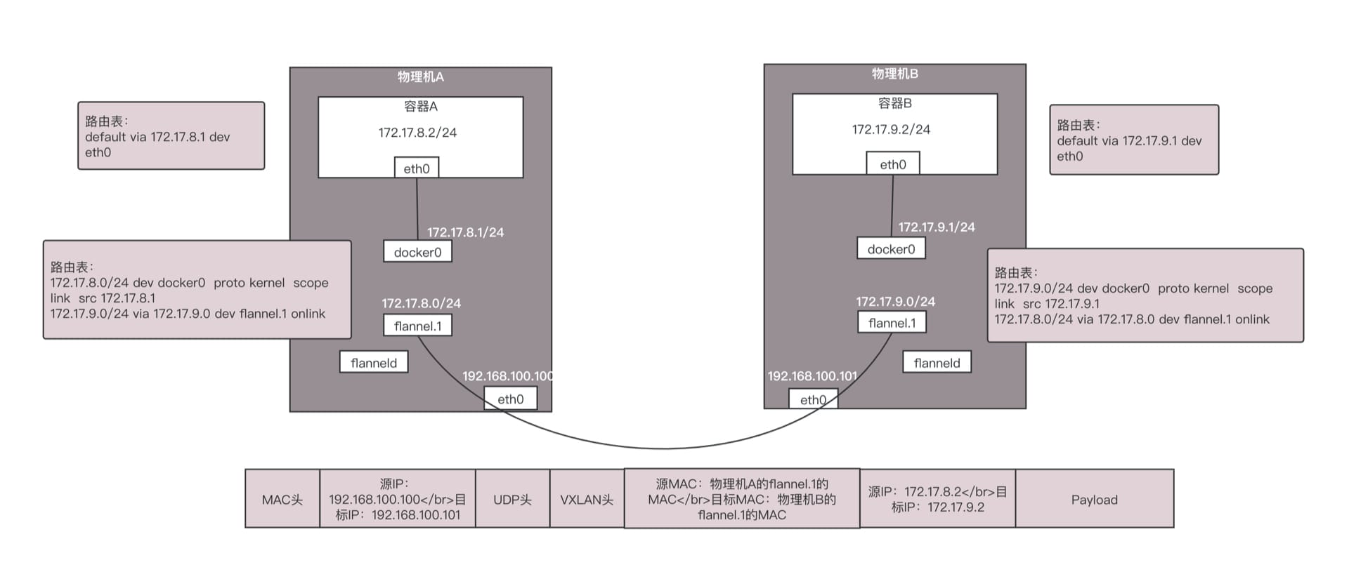 内部的MAC地址这样写:源为物理机A的flannel.1的MAC地址,目标为物理机B的flannel.1的MAC地址,在外面加上VXLAN的头。