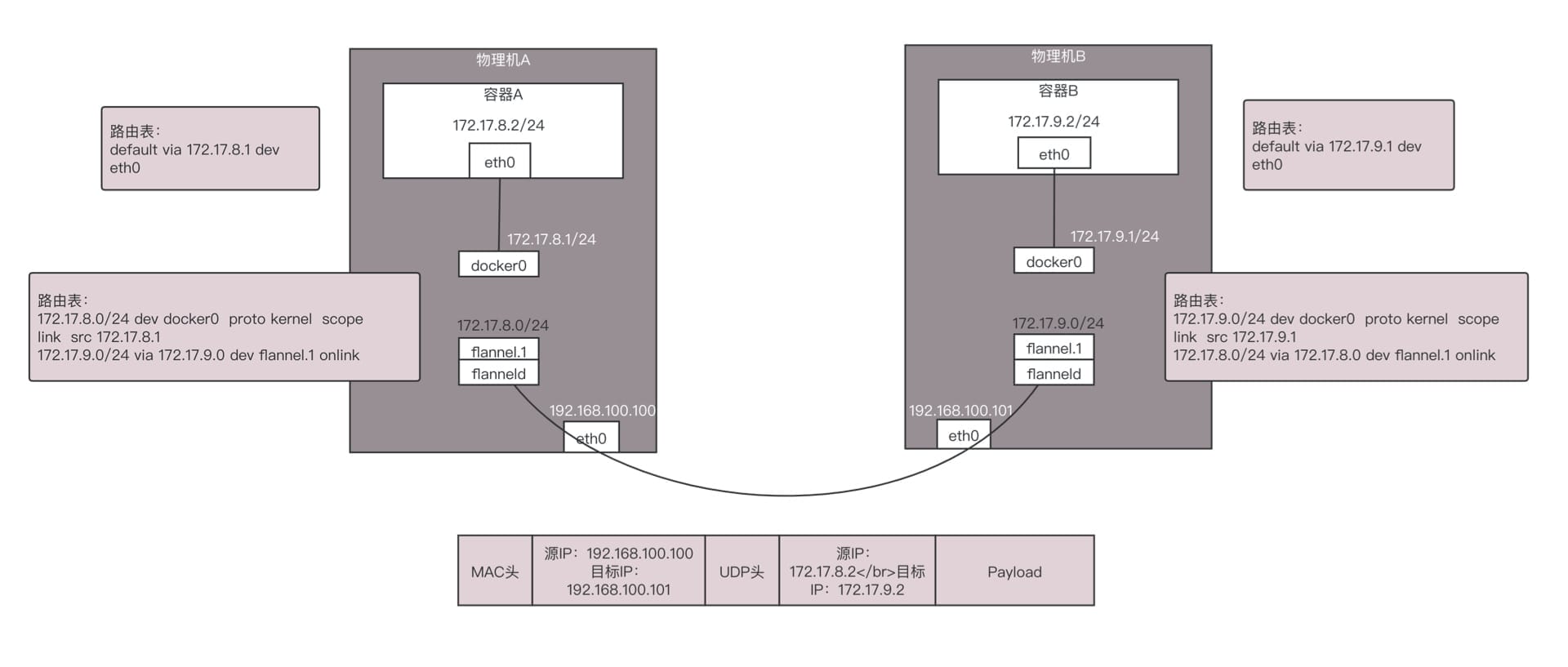 物理机A上的flanneld会将网络包封装在UDP包里面,然后外层加上物理机A和物理机B的IP地址,发送给物理机B上的flanneld。